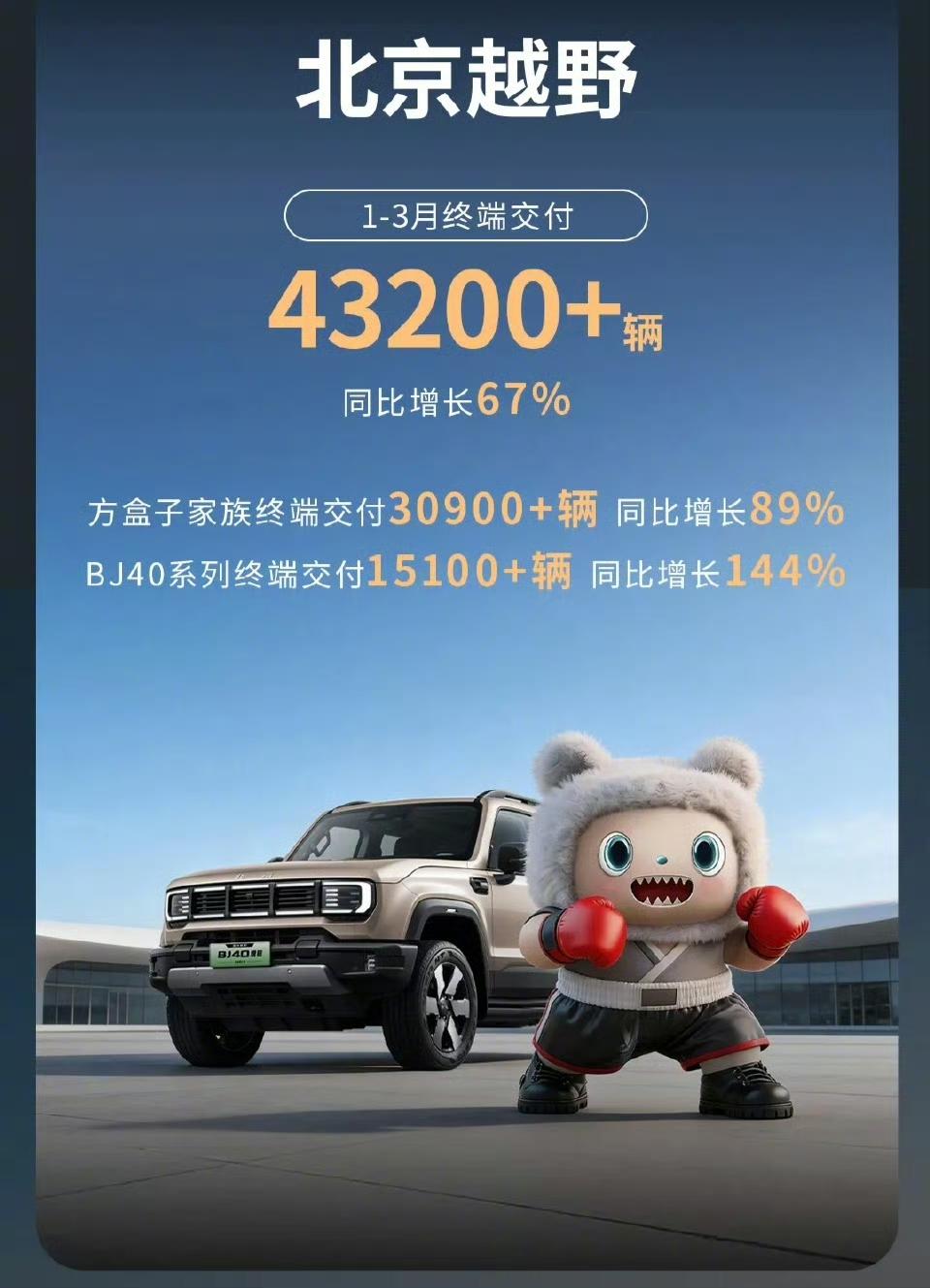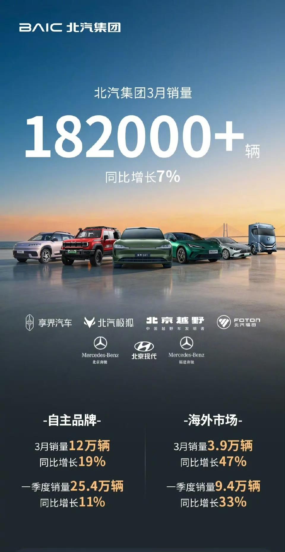 北汽集团3月份销量超18.2万辆,同比增长7%,一季度累计销量超过40万辆,超过广汽集团、长城汽车,累计销量在10大车企中排名第8位。 ●自主品牌3月份销量12万辆,占比65.9%;一季度累计销量25.4万辆,占比63%; ●海外市场3月份销量3.9万辆,占比21.4%;一季度累计销量9.4万辆,占比23.5%; ●分产品看一季度 享界汽车超13000辆 北京越野超43200辆 北汽极狐超28000辆