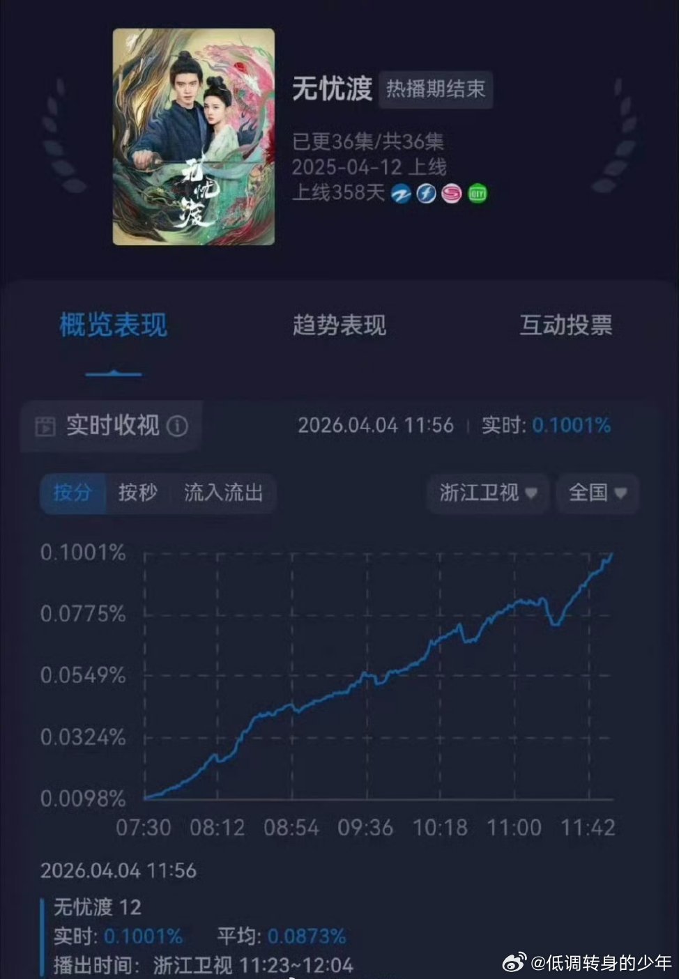 浙江卫视上午档重播宋祖儿《无忧渡》,收视率从0.0098强势拉升至0.1,涨幅超