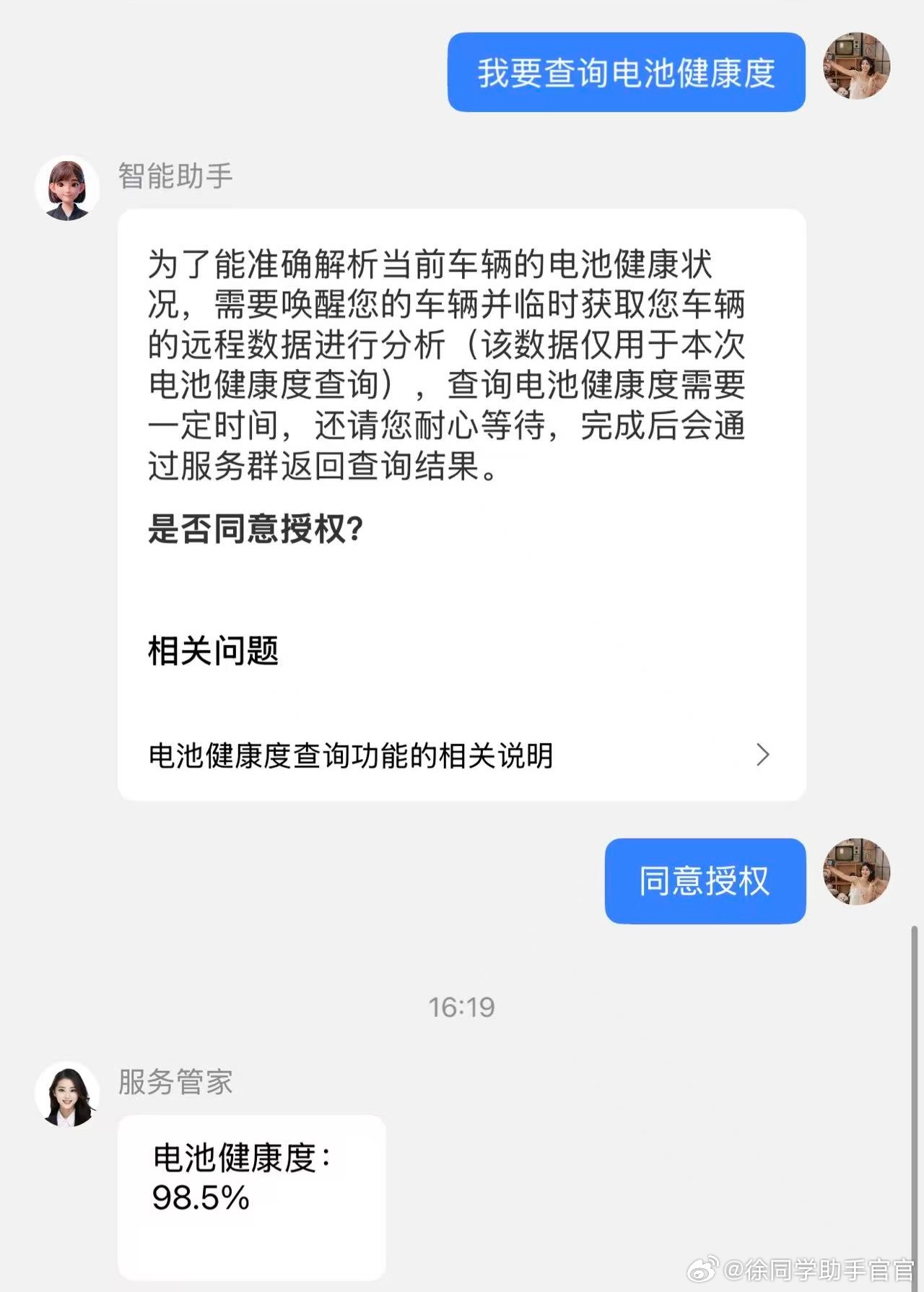 3️⃣发送查询话术:“帮我查询一下我的车辆电池健康度报告”、“我要查询电池健康度”等,均可;