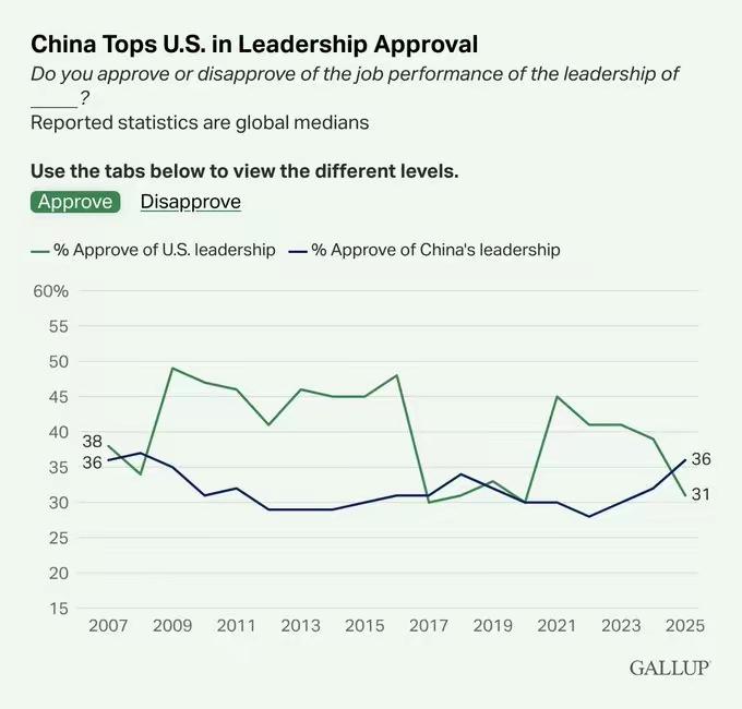 美国民调显示中国在全球影响力和领导力大幅领先美国 据美国民调机构盖洛普(GalluP)4月3日消息,在其对全球超过130个国家进行统计后,中国的全球领导力中位数以36%大幅领先美国5个百分点。这也是2017年小幅超越美国后再次大幅领先美国。 特朗普如果不能妥善的处理好此次伊朗危机,必然会让美国的影响力再度下降。