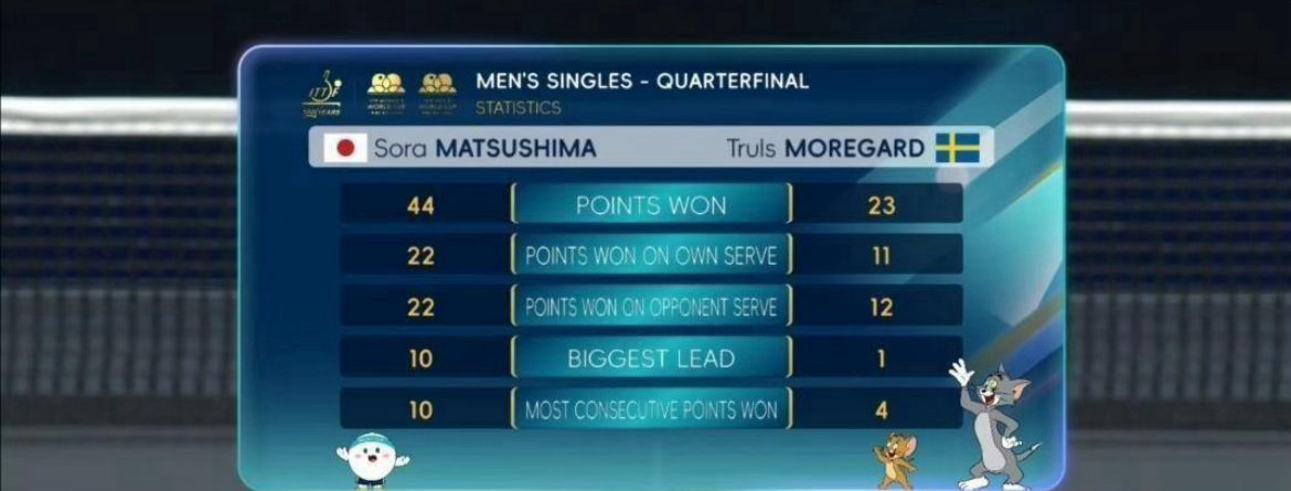 • 速度压制:松岛辉空全程以近台快攻衔接,用极致的速度和落点控制,让莫雷加德赖以成名的侧切、旋转变化完全无法施展。