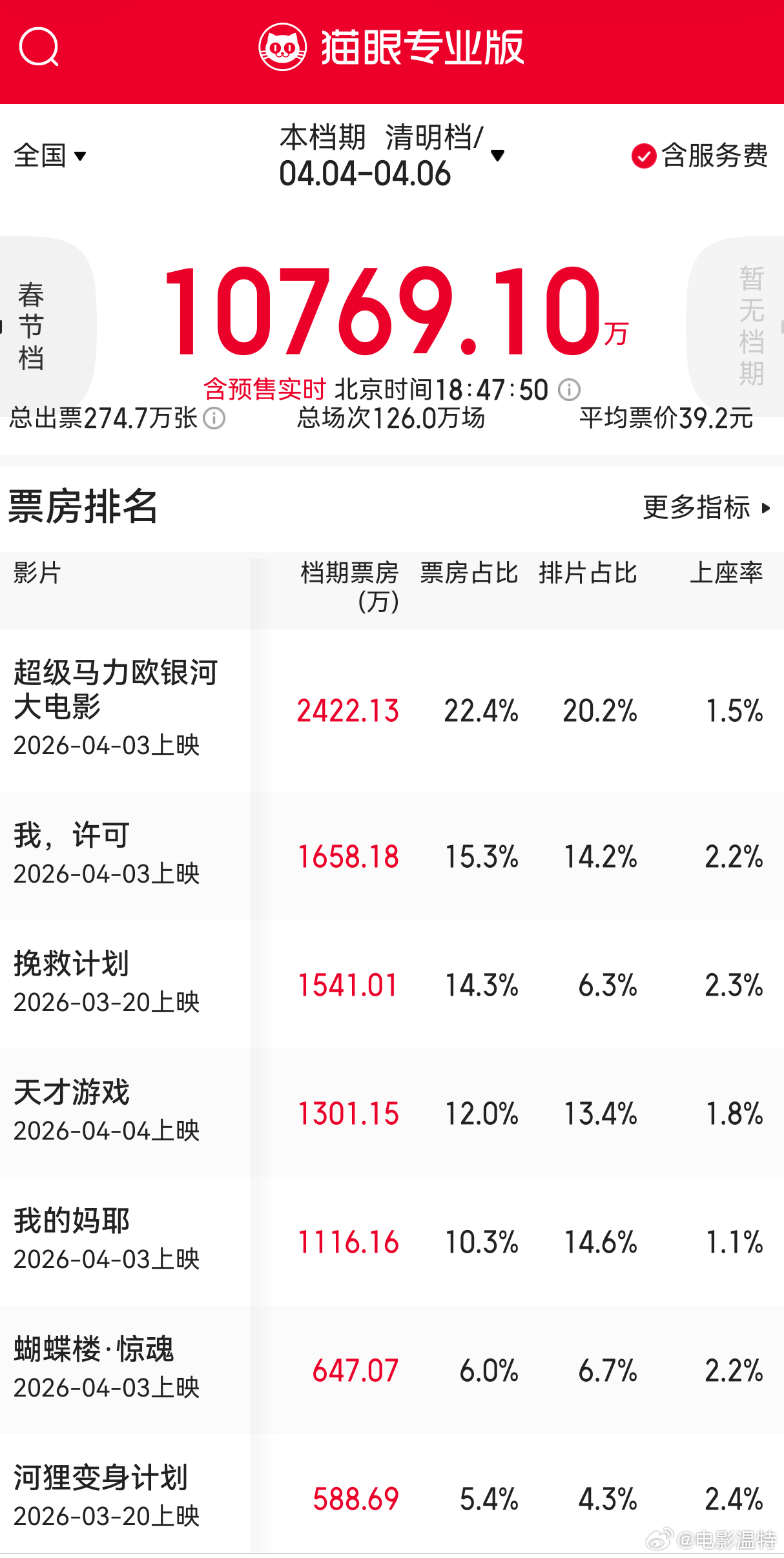 听听温特怎么说 2026清明档,票房破亿!(含预售)。《马里奥》《我许可》《挽救计划》《天才游戏》《蝴蝶楼·惊魂》前五。去年清明档3.7亿,今年清明档冲击3亿。