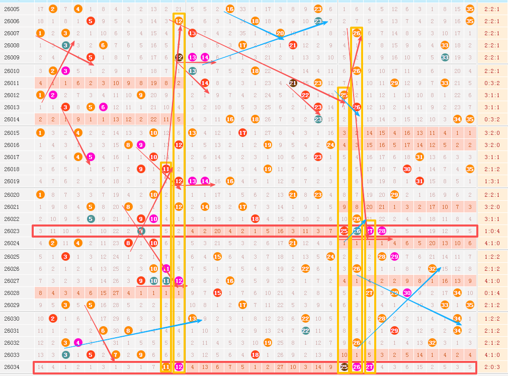大乐透26035期一等奖选号思路: 上期开出11.12.25.26.27。从三分区走势来看,区间比为2:0:3,大小比为3:2,断区二区。奇偶比为3:2。一组连号11-12,一组三连号25-26-27。从三分区近30期走势来看,一区一组连号11-12,同时间隔6期回落。龙头11在近30期内回落了4次,多以和12衔接回补,重号1次。12在30期内回落了7次,在历史走势中,衔接号码13次数居多。从历史走势来看,本期龙头看好奇数热号回补。二区断区,30期内断2次二区。从走势图来看,都是在号码以斜连号走势1码之后断区,从走势来看,二区号码逐步走冷。本期防守1码回落。三区上期回落3码,一组三连号25-26-27,冷热组合。同时间隔10期三码同时回补。凤尾27间隔5期回补。在30期内回落了3期。属于近期的热号,近期三区号码逐步走热,本期结合历史走势来看,凤尾看好偶数回补。综上所述:本期区间比看好2:2:1,大小比看好2:3。防守1码重号。