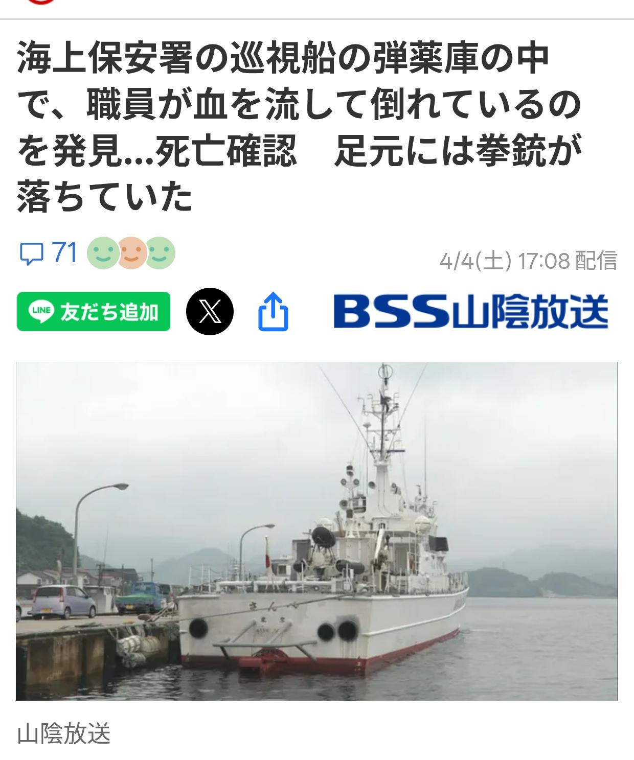 日海保巡逻船弹药库发现一人死亡 据日本海上保安厅境海上保安署通报:4月3日在隠岐海上保安署所属的巡逻船内,一名海保队员满身是血倒地。事发地点在海保巡逻船的弹药库内,一把手枪掉落在脚旁。 被确认死亡的是一名40多岁的男子,是岛根县三瓶海上保安署巡逻船的船员。 据境海上保安署称,4月3日晚上7点30左右,一搜停在隠岐海上保安署前栈桥码头的巡逻船弹药库发现有人流血倒地。急救人员进行了心肺复苏,之后确认其死亡。 当时死亡队员正在值班,船上除了死者外,还有两名船员。 死亡原因仍在调查中。 钓鱼岛 东海 军舰下水事故 船员死亡