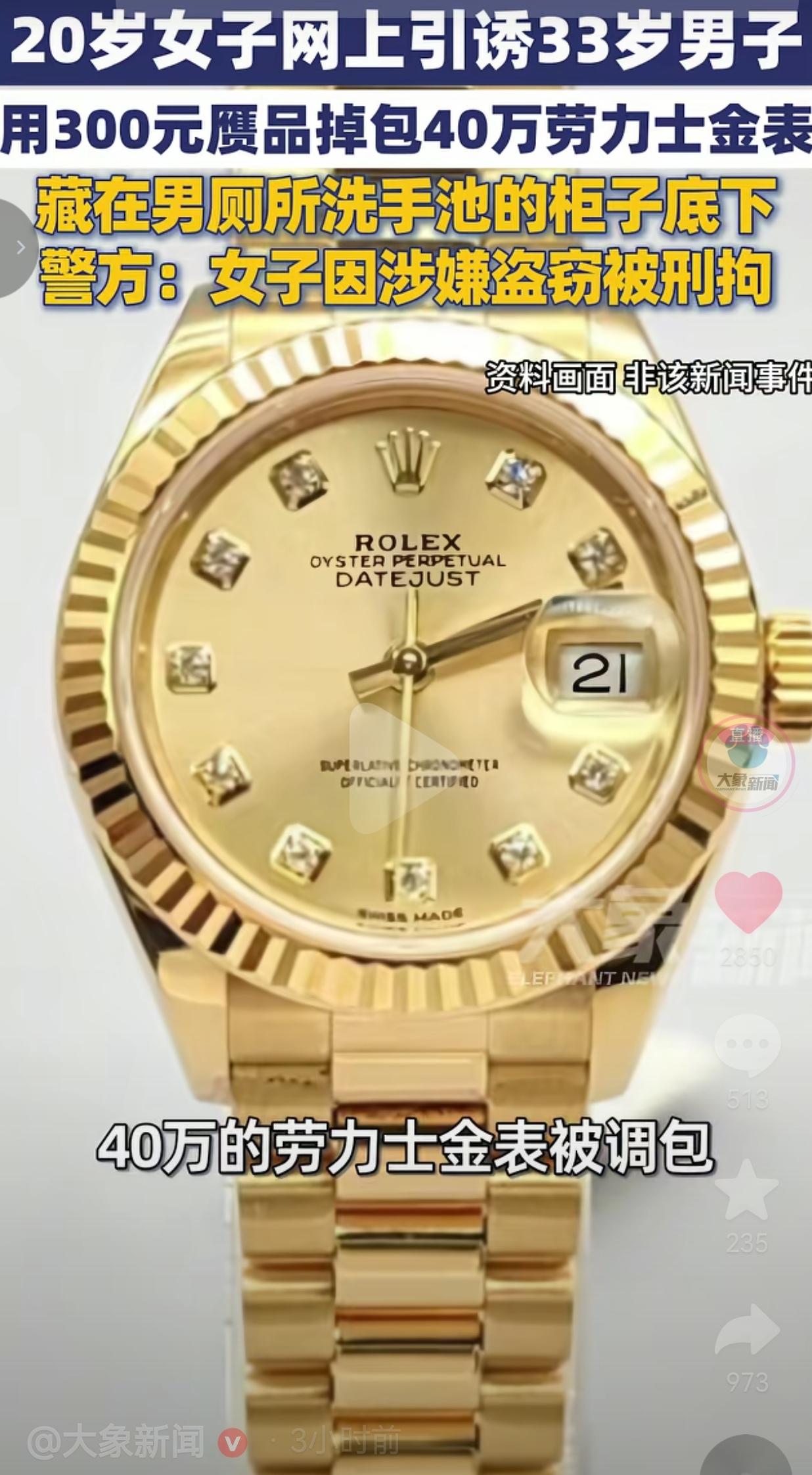 离谱!,一个20岁小姑娘,居然用300块的假货,把33岁大哥40万的劳力士金表给调包了,还藏在男厕所柜子底下,这剧情比电视剧还敢演! 事情起因就特离谱——北京这33岁大哥平时爱上网,认识了个20岁的女网友。 俩人线上聊得火热,大哥还主动请人家吃过一次饭,这次轮到女网友回请,大哥那叫一个开心,压根没多想就赴约了。 更绝的是,这小姑娘一见面就说:“哥,我想买块好表,想试试你那块40万的劳力士。” 咱就是说,四十万啊!不是四十块!换谁不得掂量掂量?但这大哥也是心大到没边,估计是被“妹妹”的甜言蜜语哄得晕头转向,居然就信了! 他还特实在,出门直接带了三块手表赴约,真把人家当知心妹妹,生怕人家试戴不够尽兴。 到了饭馆,女网友拿着表各种试戴,对着大哥一顿猛夸,聊得热火朝天。 趁大哥去上厕所的空档,这小姑娘直接动手了!她拿出提前网购好的300块赝品,瞅准机会就把价值40万的真金表给调包了。 更鸡贼的是,她没把假表带走,反而藏在了一楼男厕所洗手池的柜子底下,就等着大哥发现不对时,还能把假表拿出来蒙混过关,心思也太坏了! 等大哥从厕所回来,没一会儿就发现不对劲了:手里的表手感不对、重量轻了,质感更是差远了,一查才知道被调包了。 他当时脸都白了,四十万的东西说没就没,吓得赶紧报警。 警方顺着线索一查,很快就锁定了这名20岁女子,最终在男厕所柜子底下把赃物给找着了。 目前,女子因涉嫌盗窃已被依法刑事拘留,案件还在进一步办理中,这小姑娘彻底栽了! 网友看到后评论说:这大哥心也太大了,40万的表说借就借?怕不是被美色冲昏头了! 也有的网友说:300块换40万,这买卖做得比印钞机还狠,小姑娘胆子是真肥,就是用错地方了! 还有的网友说:心疼大哥一秒,但更想笑!带三块表赴约,怕不是把人家当“表贩子”了吧? 也有的网友说:男厕所藏赃物也是绝了,这操作也是没谁了,法网恢恢疏而不漏,早晚得栽! 300块的成本就想骗40万,心黑得没边,小小年纪不走正道,专搞歪门邪道;好笑的是大哥也太实在了,真把网上的陌生人当“亲妹妹”,四十万的东西说试就试,防人之心弱到离谱! 咱就说,网络一线牵,珍惜这段缘是没错,但也得分人啊!这女网友从头到尾就是一场精心策划的骗局,她利用的就是大哥的信任、大哥的大方,把人家的善良当成了可欺负的软肋。 四十万的劳力士,那是普通人一辈子都未必能攒下的钱,大哥的轻信,女网友的贪婪,最后换来的就是法律的制裁,一点不冤! 现在网上总有人说“网友都是好人”,但真别太天真!隔着屏幕谁知道对面是啥人?是真心想跟你交朋友,还是盯着你的钱包、你的贵重物品?这事儿就是个活生生的血淋淋的教训,不管是男是女,网上见面、借贵重物品,都得留一百个心眼,别被几句甜言蜜语就冲昏了头! 更要提醒所有人:网络从来不是法外之地,别以为耍点小聪明就能瞒天过海,天网恢恢疏而不漏,你做的每一件违法的事,早晚都会被揪出来!而善良的人,更要懂得保护自己,别让你的好心,成了别人伤害你的武器! 最后我想说:别拿网上的甜言蜜语当真心,别把贵重物品随便借陌生人,贪婪的人终会自食恶果,轻信的人只会踩坑买单! 对此,你怎么看?