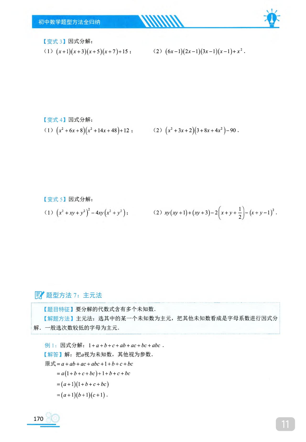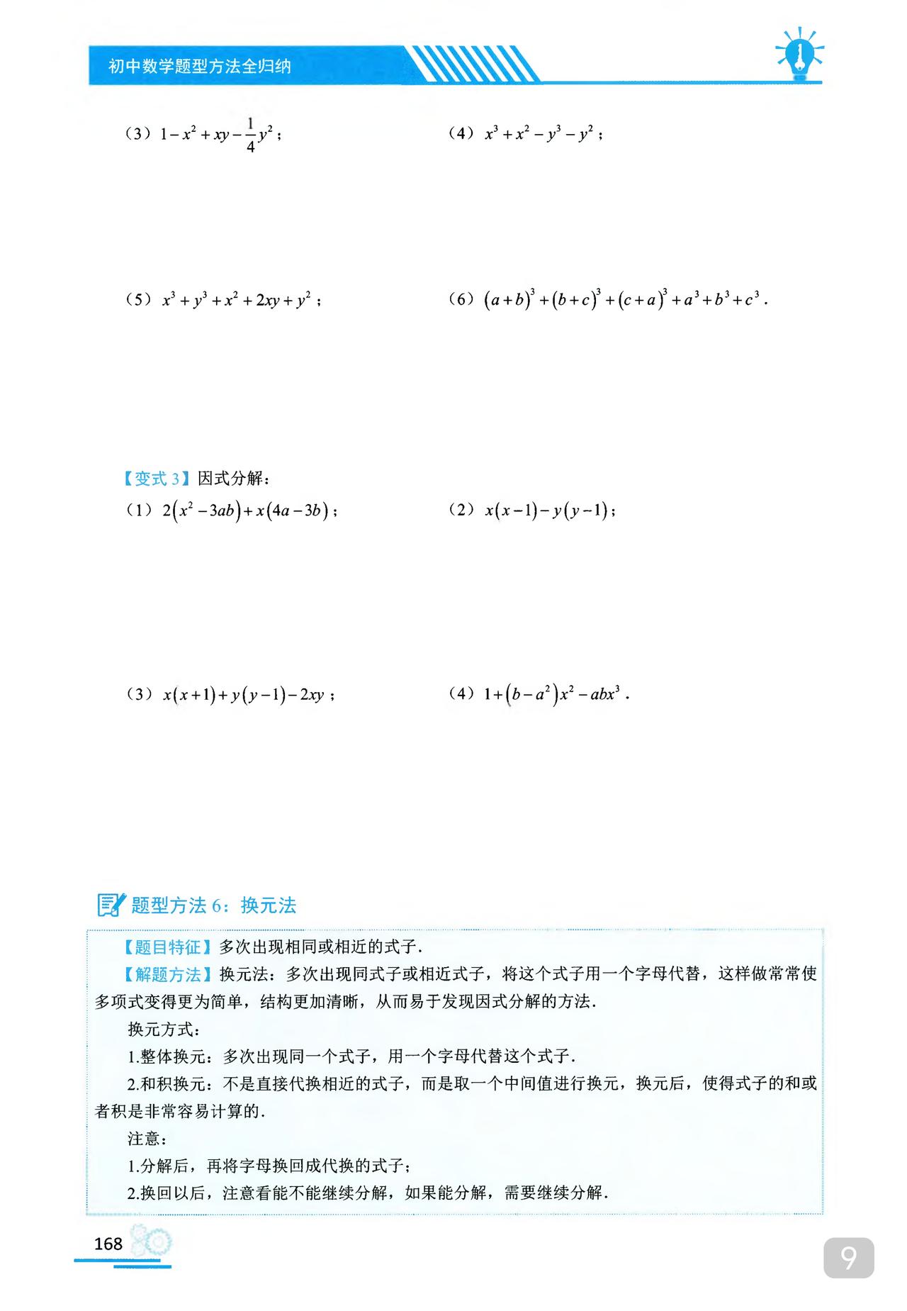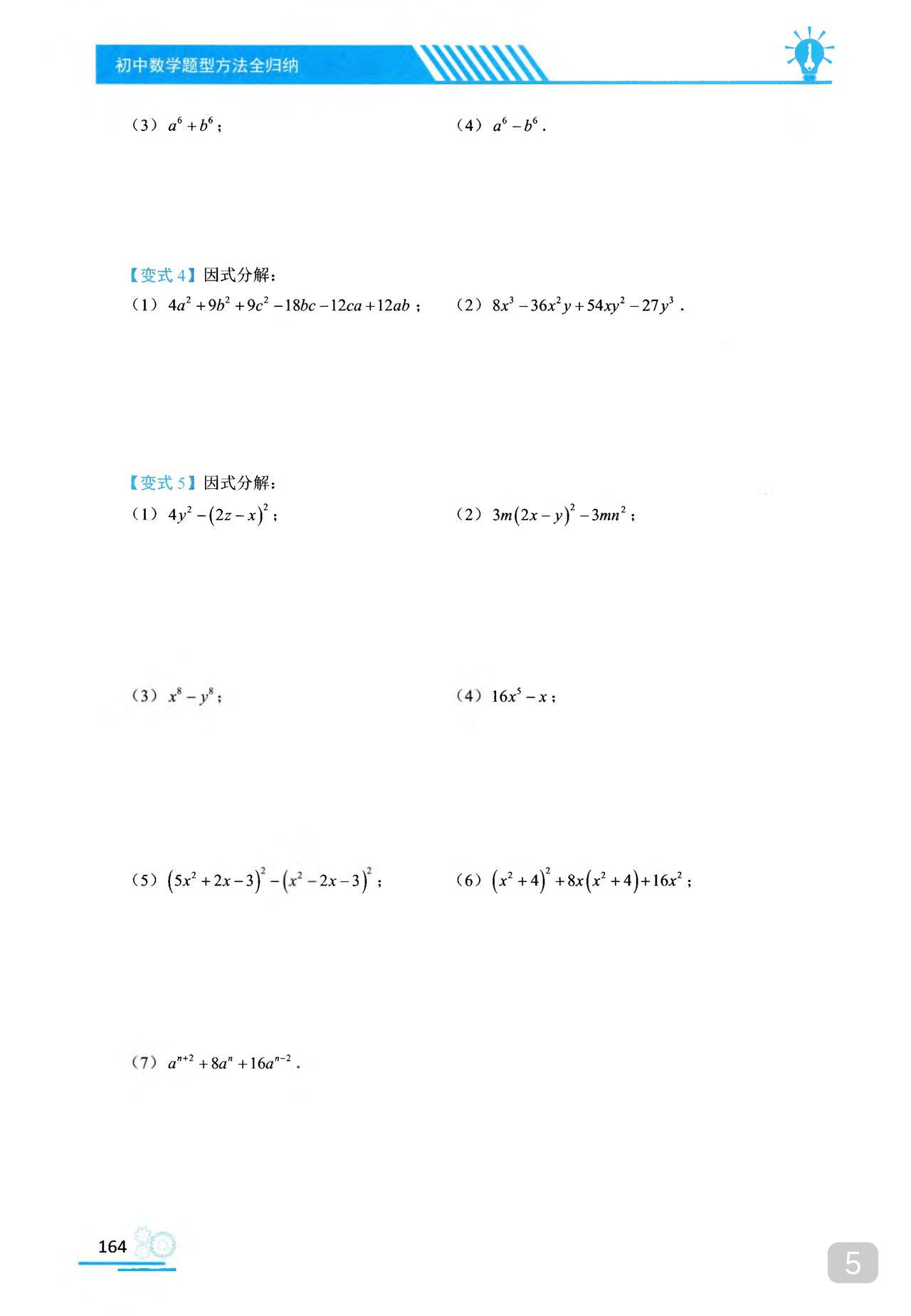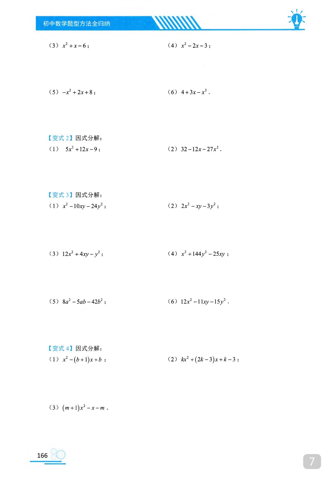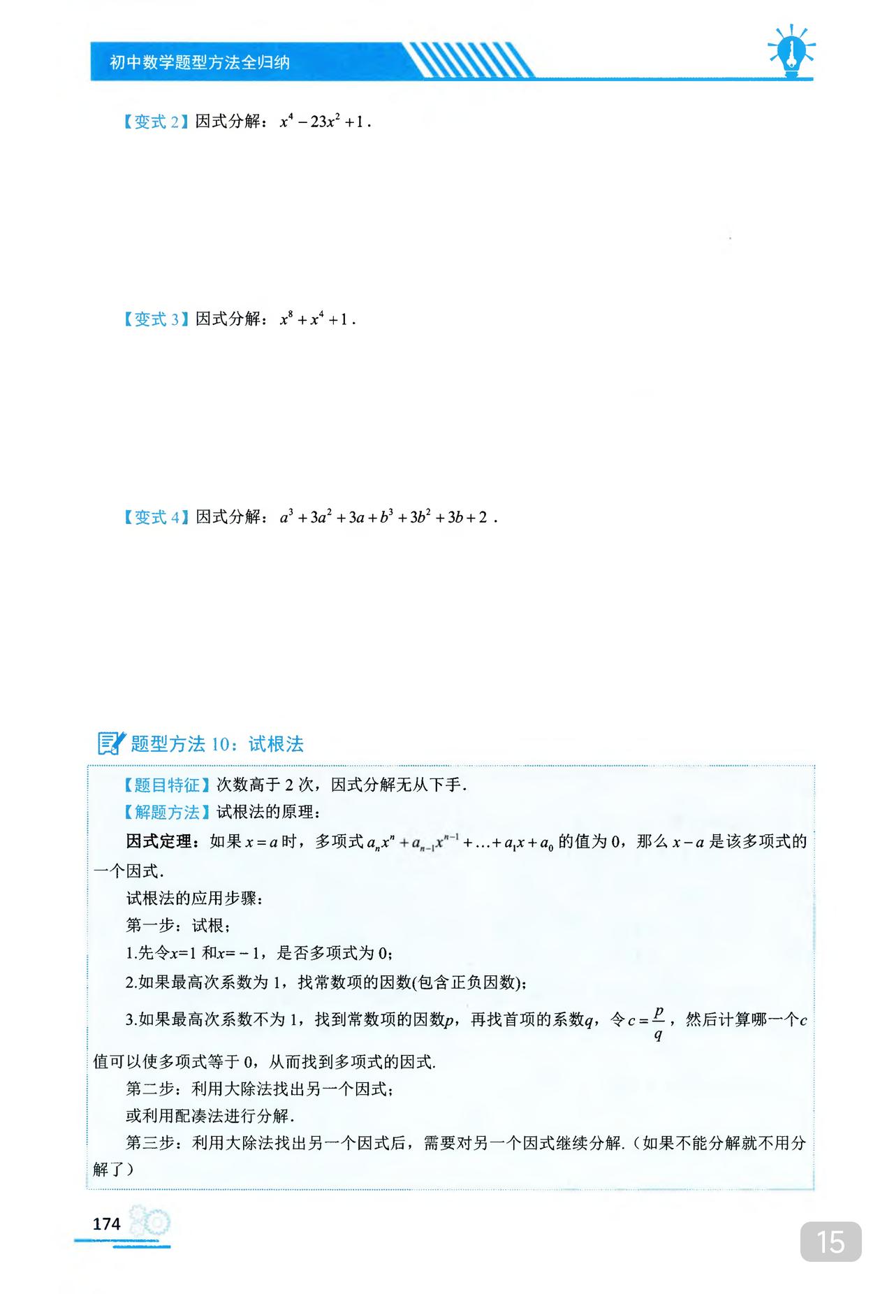 我推的书不多 《初中数学题型方法全归纳》是我常推的 因为它足够好 真正的全归纳 想中考胜出 刷它的一半就够了 想打竞赛 刷它的全部 以因式分解为例 分门别类一次让你刷透 初中数学题型方法全归纳397种题型方法(带397节视频题库系统)