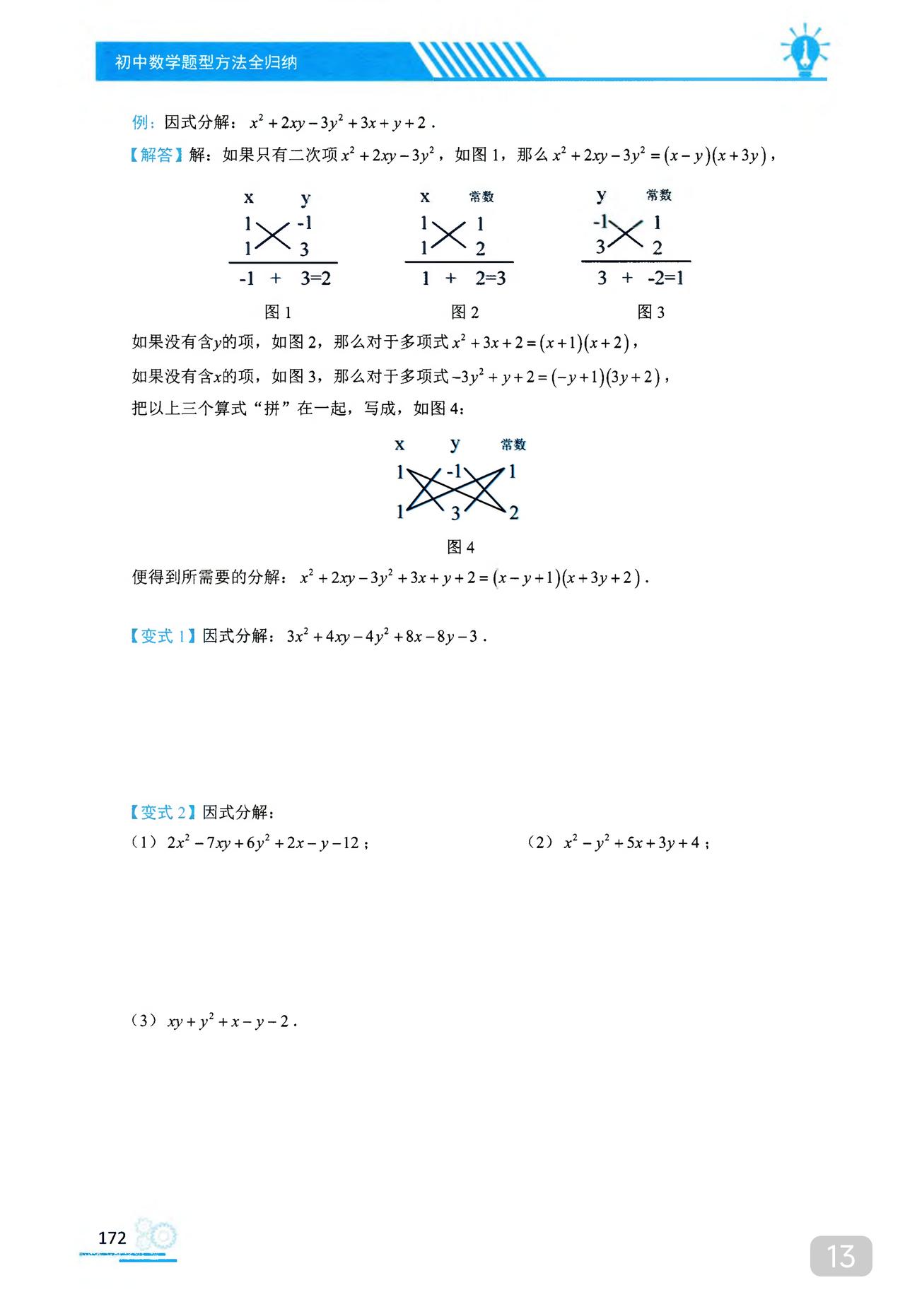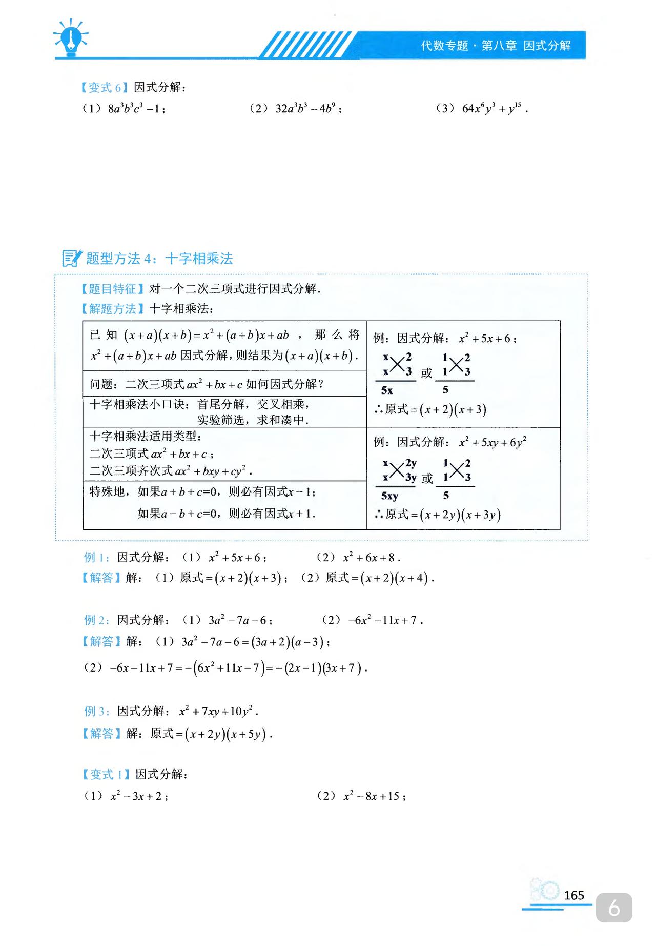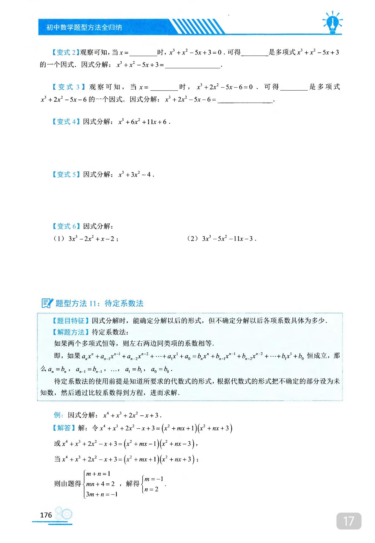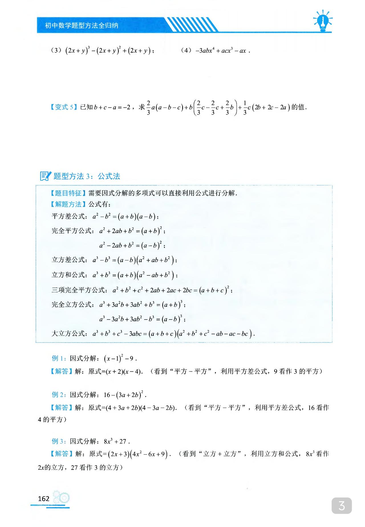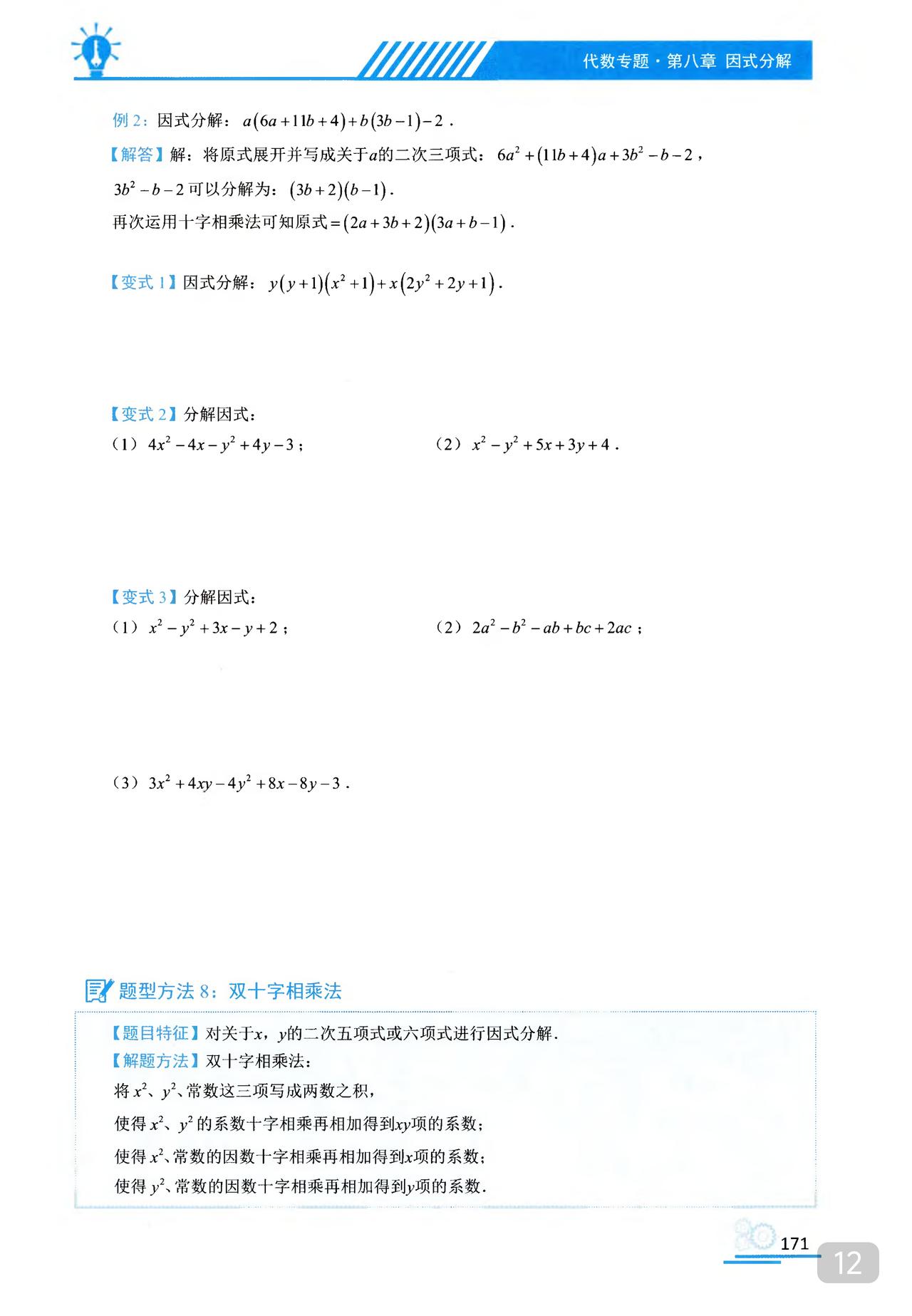 我推的书不多 《初中数学题型方法全归纳》是我常推的 因为它足够好 真正的全归纳 想中考胜出 刷它的一半就够了 想打竞赛 刷它的全部 以因式分解为例 分门别类一次让你刷透 初中数学题型方法全归纳397种题型方法(带397节视频题库系统)