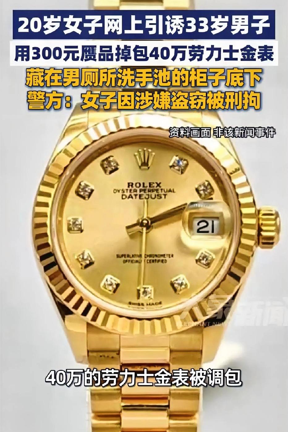 40万劳力士被女网友调包!全网吵疯:男的活该,还是女的犯罪? 33岁男约20岁女网友奔现,40万劳力士被调包成300元假表,女子盗窃被刑拘! 这事直接把网友吵到互撕: ✅ 挺男派:女的就是诈骗犯!不管男的什么目的,偷东西就是犯罪,必须重判! ❌ 骂男派:活该!一把年纪约小13岁网友,戴40万表炫富,不骗你骗谁? 有人说男的动机不纯,被骗是自食其果; 有人骂女的心术不正,为了钱毫无底线。 更有人戳破真相:这场奔现,男的图色,女的图财,没有一个无辜者! 你站哪边? 男的活该?还是女的太狠? 评论区开战!