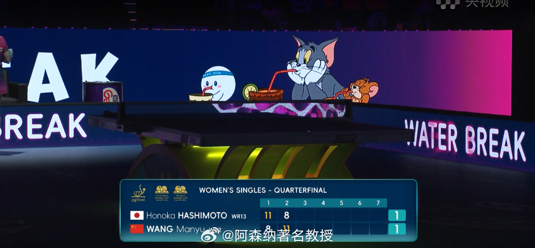 乒乓球 王曼昱11比8桥本帆乃香 王曼昱vs桥本帆乃香 双方互送一局11比8,场上比分1比1平