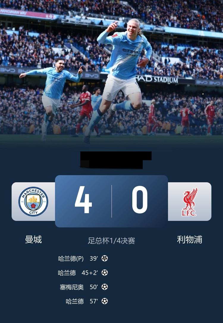 足总杯 曼城4-0利物浦进四强 哈兰德帽子戏法,萨拉赫遗憾失点 4月4日19:45,足总杯1/4决赛,曼城主场对阵利物浦。上半场,哈兰德点射命中,哈兰德头球完成梅开二度。下半场,塞梅尼奥扩大比分,哈兰德帽子戏法,萨拉赫射丢点球。最终,曼城4-0利物浦,挺进四强