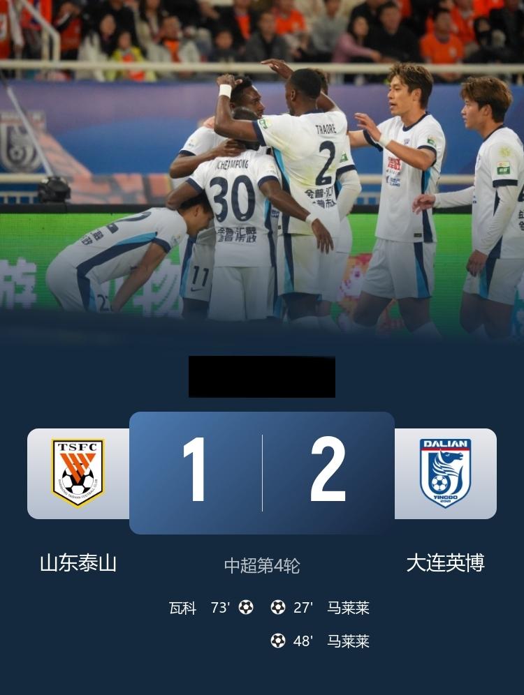 中超 泰山1-2英博 马莱莱梅开二度,瓦科破门 4月4日19:00,中超第4轮,山东泰山主场迎战大连英博!上半场,马莱莱补射建功!下半场,马莱莱完成梅开二度;瓦科扳回一城。最终,山东泰山1-2大连英博!泰山暂积0分第10;大连英博先赛积6分暂升第4