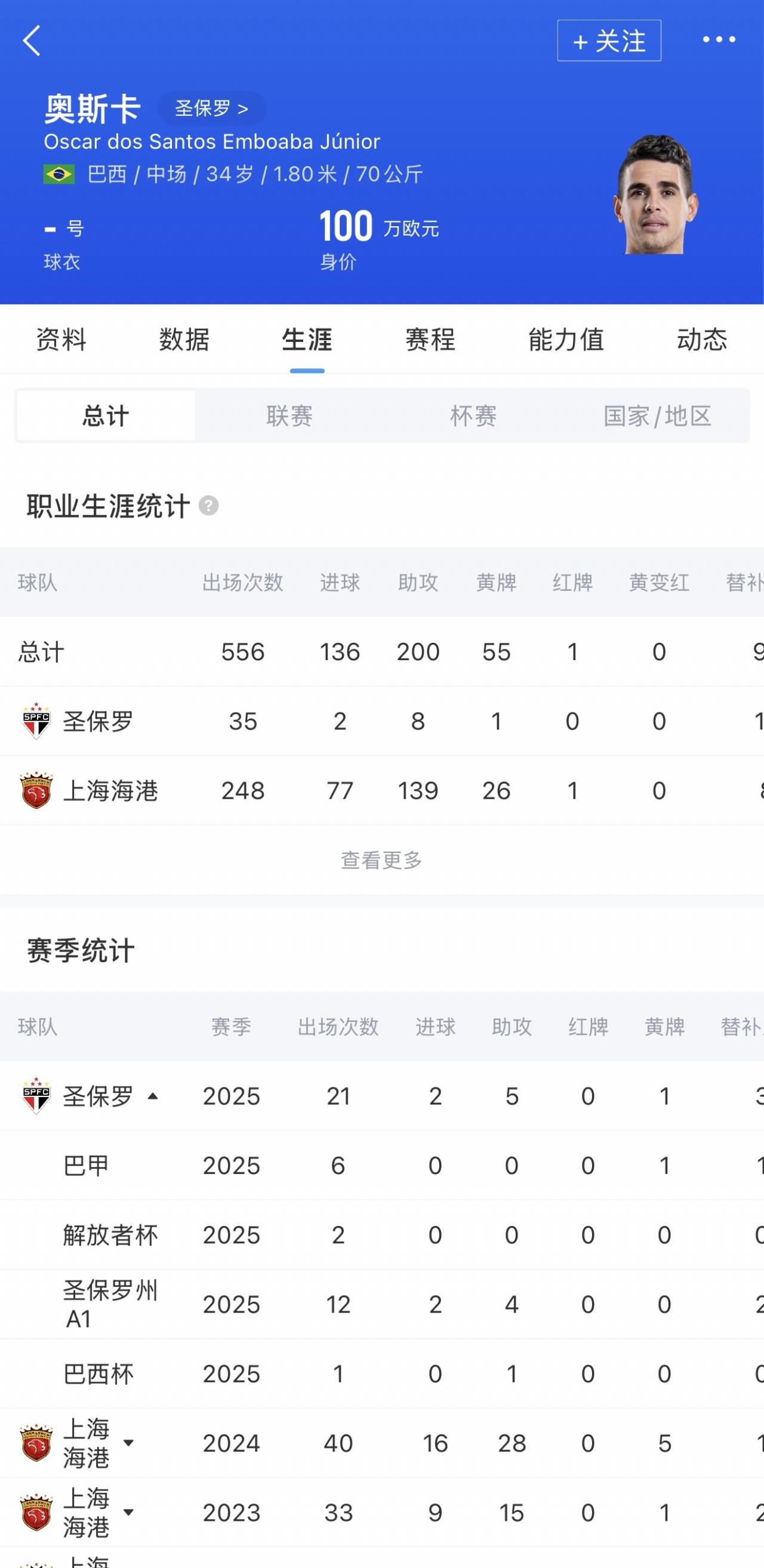 官方:34岁巴西中场奥斯卡因病退役,曾效力圣保罗 切尔西和上海海港 04月04日 官方消息,34岁奥斯卡与圣保罗解约,并宣布退役。他曾效力圣保罗、切尔西和上海海港,17年职业生涯获两座英超冠军+三座中超冠军。 奥斯卡2007年以6000万欧从切尔西加盟上港,共出场248次打入77球141次助攻,获得三座中超冠军2018、2023、2024,一座超级杯冠军(2019),一座足协杯冠军(2024)
