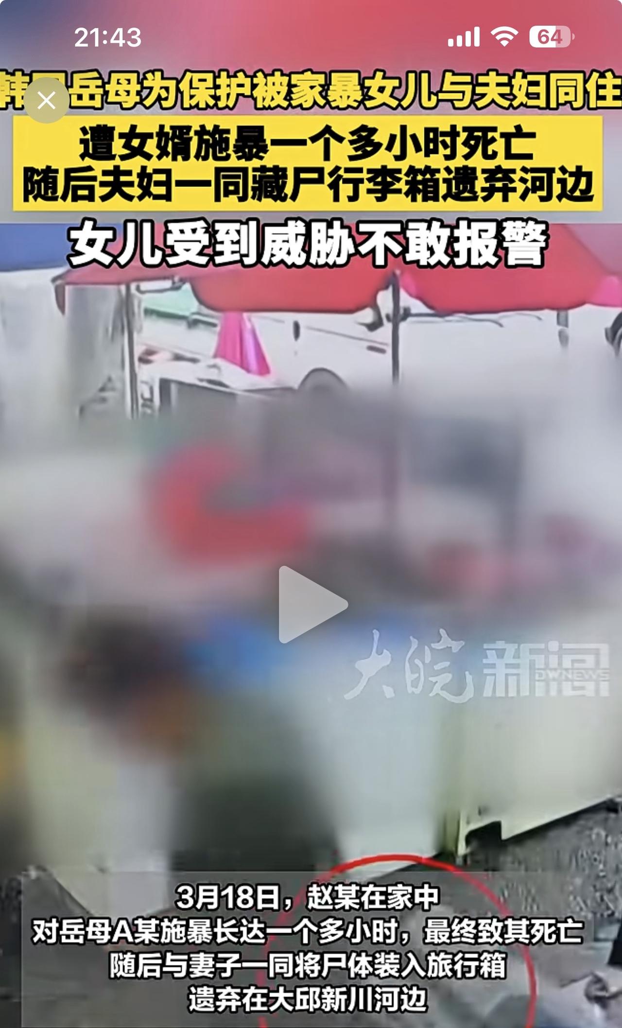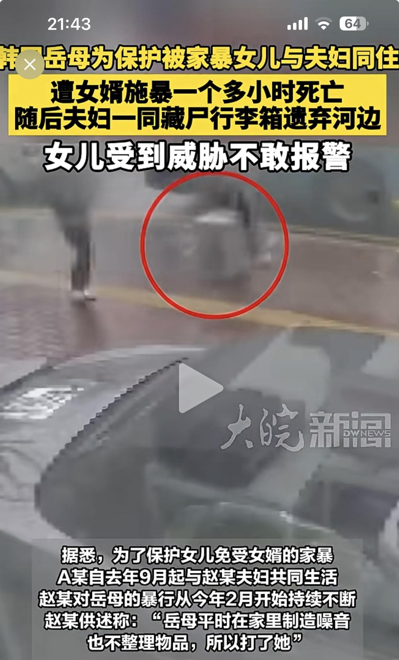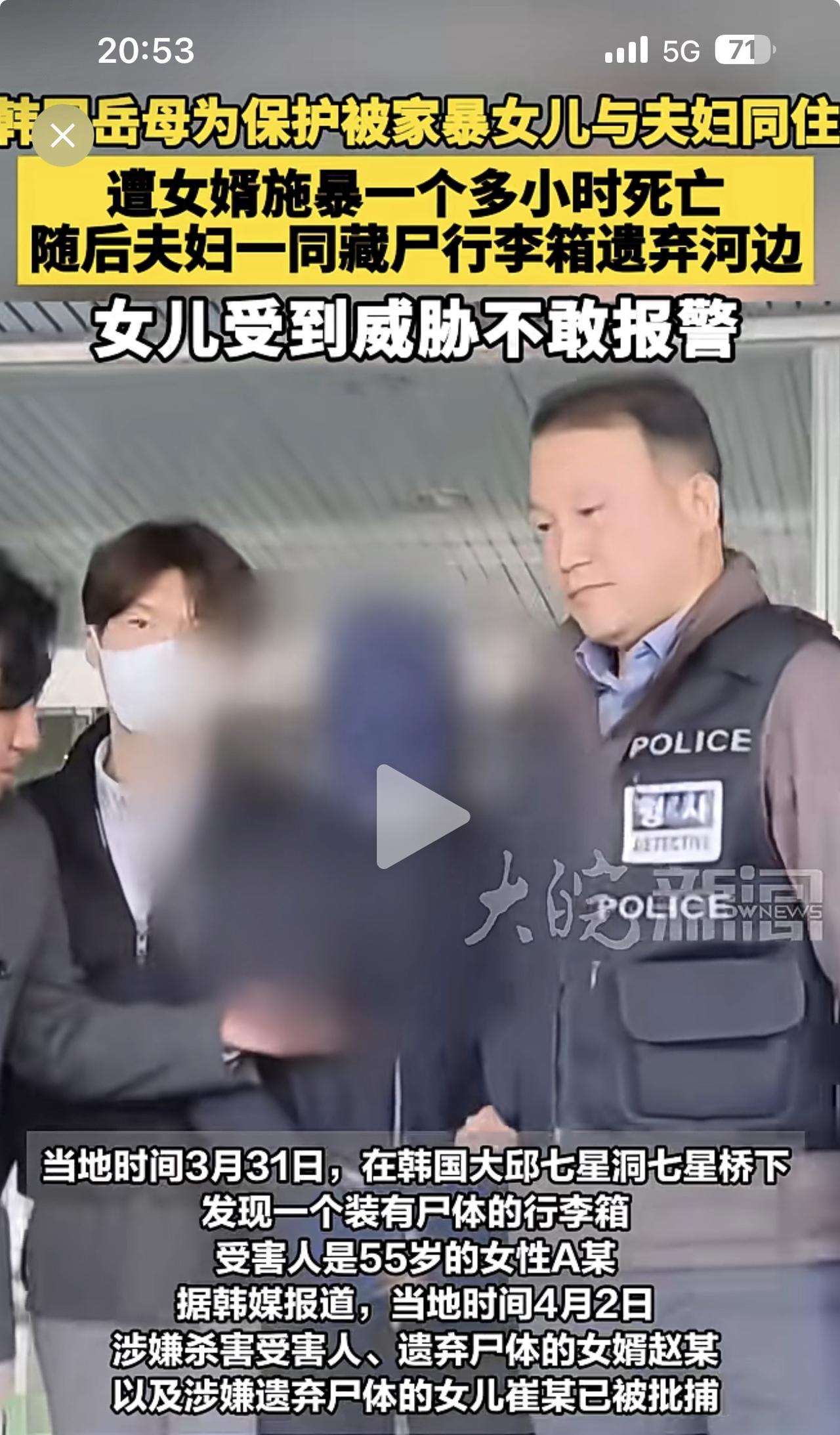 我的天呐,岳母为保护被家暴的女儿,却惨遭女婿施暴一个多小时后死亡,装行李箱抛尸河边。 这件悲惨事件发生在韩国大邱,岳母为保护女儿才搬去与女儿女婿一家生活在一起的,没想到不但没有保护好女儿,自己反而被长时间家暴,最终于3月18日被家暴致死。 事发后,被害人的女儿被丈夫威胁,不要报案,不要接电话,被迫与丈夫一起抛尸,真的太懦弱了!这个丧心病狂的家暴男应该被判处死刑。 不过,韩国现在在法律上虽然至今保留着死刑,但自1997年后就再也没有执行过一例,被国际社会普遍视为“实际上已废除死刑的国家”。这是非常遗憾的。 我个人认为,所有国家都不应该废除死刑!凭什么守法公民就应该被杀死,而凶犯却要享受所谓的人权?你们有什么想法,评论区讨论。