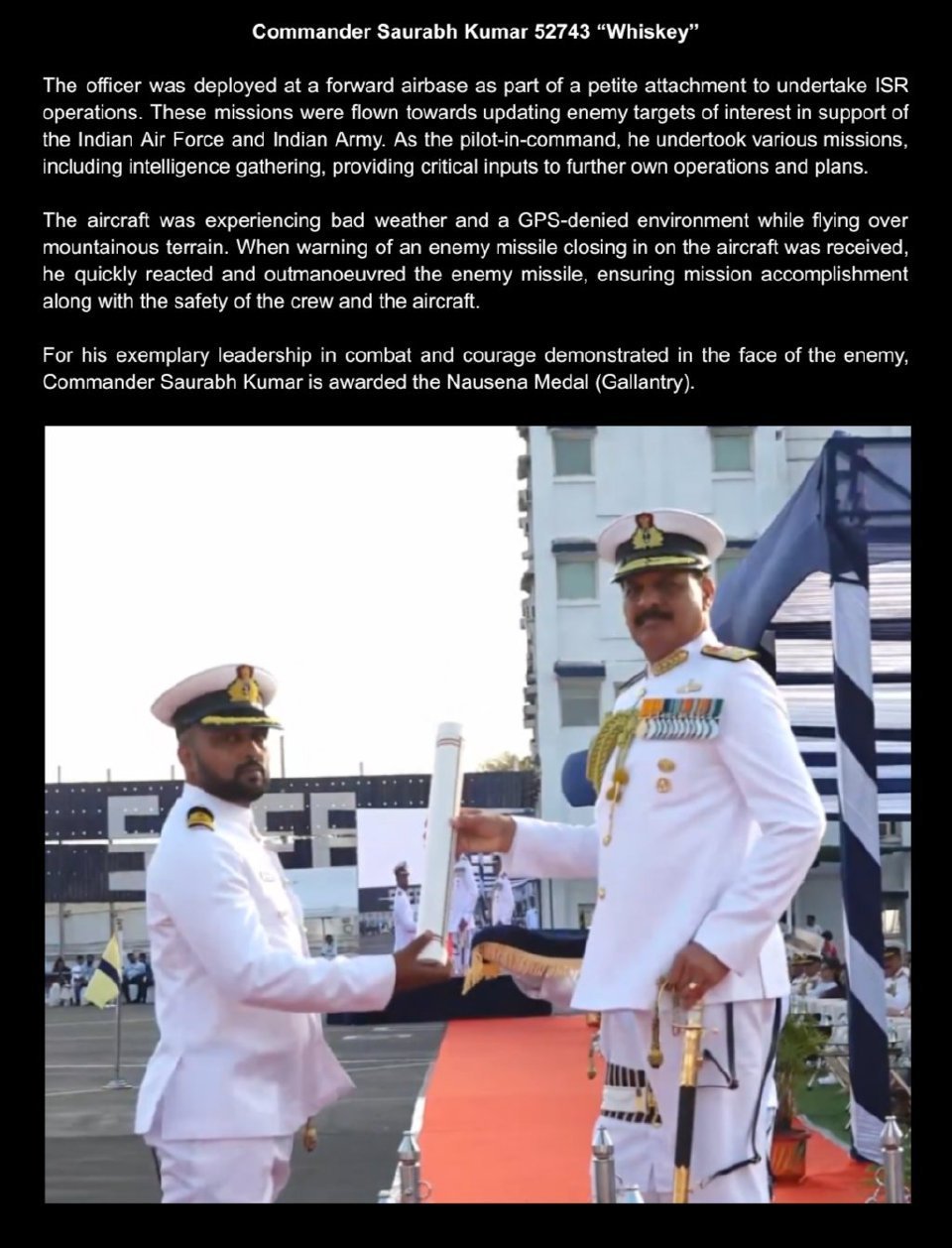 该军官被部署至前沿空军基地,执行情报、监视与侦察(ISR)任务。这些飞行任务旨在更新敌方高价值目标信息,为印度空军与印度陆军的行动提供支援。作为机长,他在多山地形上空执行任务时,其驾驶的飞行器遭遇恶劣天气,且处于 GPS 信号中断环境。当收到敌方导弹逼近本机的告警时,他迅速做出反应,成功规避了敌方导弹,在确保飞行器安全的同时,圆满完成了任务。