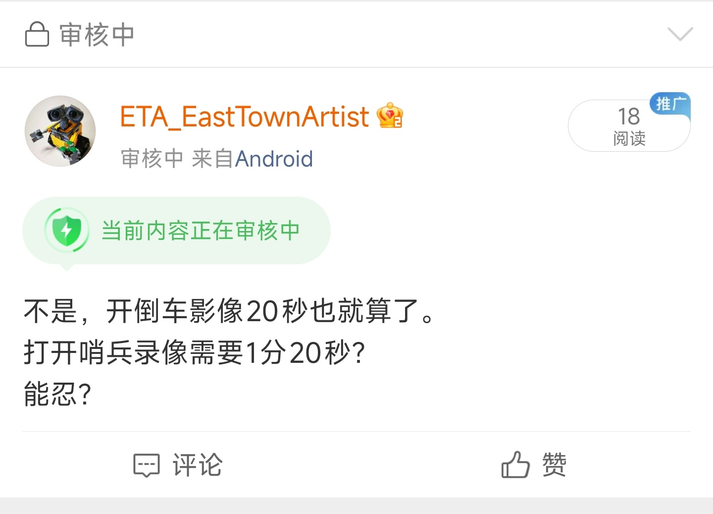不是,开倒车影像20秒也就算了。打开哨兵录像需要1分20秒?能忍?