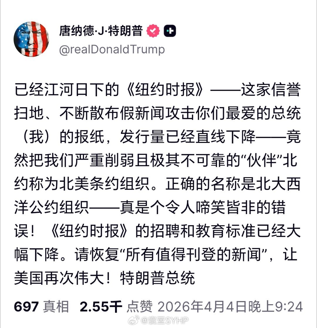 特朗普再批纽约时报特朗普发文:已经江河日下的《纽约时报》——这家信誉扫地、不断散布假新闻攻击你们最爱的总统(我)的报纸,发行量已经直线下降——竟然把我们严重削弱且极其不可靠的“伙伴”北约称为北美条约组织。正确的名称是北大西洋公约组织——真是个令人啼笑皆非的错误!《纽约时报》的招聘和教育标准已经大幅下降。请恢复“所有值得刊登的新闻”,让美国再次伟大!