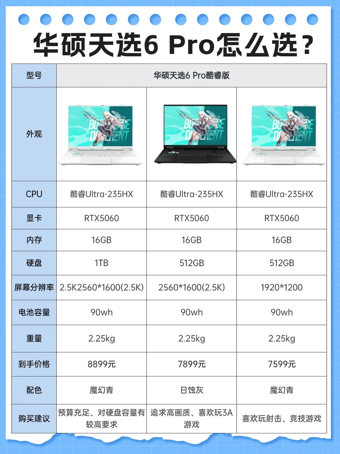 📍华硕天选6 Pro酷睿版其实都是U5-235HX + RTX5060这个核心组合,性能底子一致,区别主要在硬盘容量和屏幕,其实不难选。