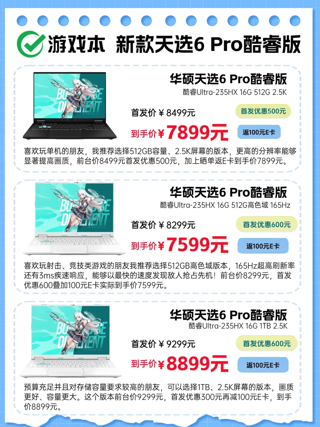 👉预算充足并且对存储容量要求较高的朋友,可以选魔幻青 1TB、2.5K屏幕的版本,画质更好、容量更大。这个版本前台价9299元,首发优惠300元再减100元E卡,到手价8899元💰