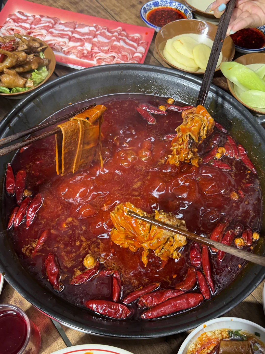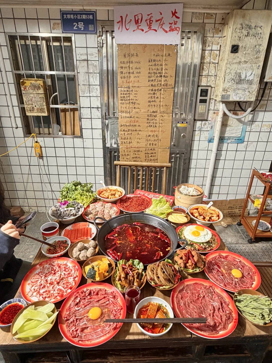 名不虚传!!!就在居民楼下!! 满满的烟火气!! 锅底是地地道道的老重庆味儿!!真的涮啥都好吃!!只需要自己调个油碟降降温就很“哇噻”了!! 除了各种鲜切牛肉以外,个人很喜欢耙鸡爪、冒节子、贝贝南瓜(每次我都要点这些),再来上一份沙葱牛肉炒饭!幸福来的就是这简单!!! 还有黑芝麻炖奶、草莓炖奶。。就没有不好吃的!!📍北里·重庆老火锅