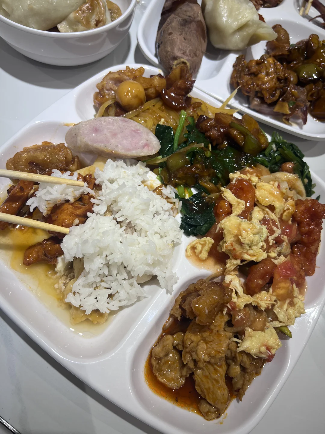 [爆炸R]下车直奔了富龙盒饭∶这是我最期待的,吃完就觉得还行吧,但是实惠种类多,也很不错了呀!!红薯特别甜,烧茄子很好吃!!
