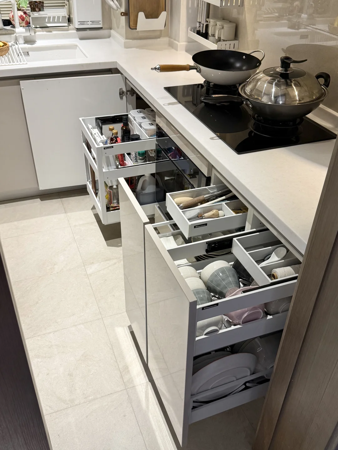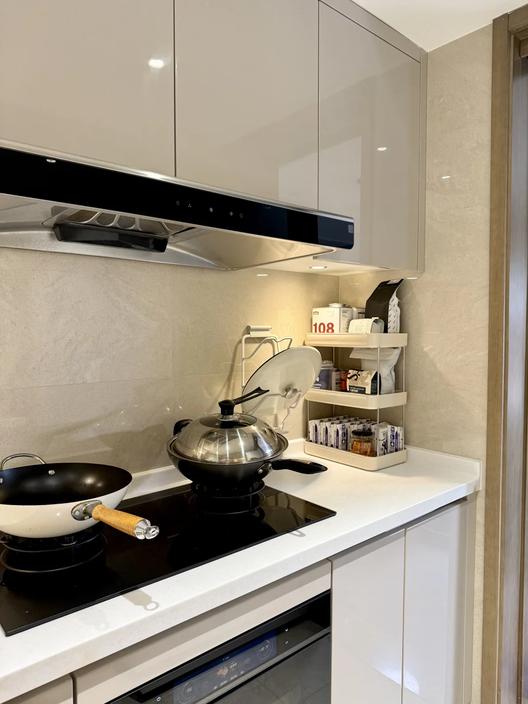 ▫️橱柜内部加装了拉篮,储物拉篮、调料拉篮、碗盘收纳拉篮,把零碎东西都藏起来,小厨房也能有大容量