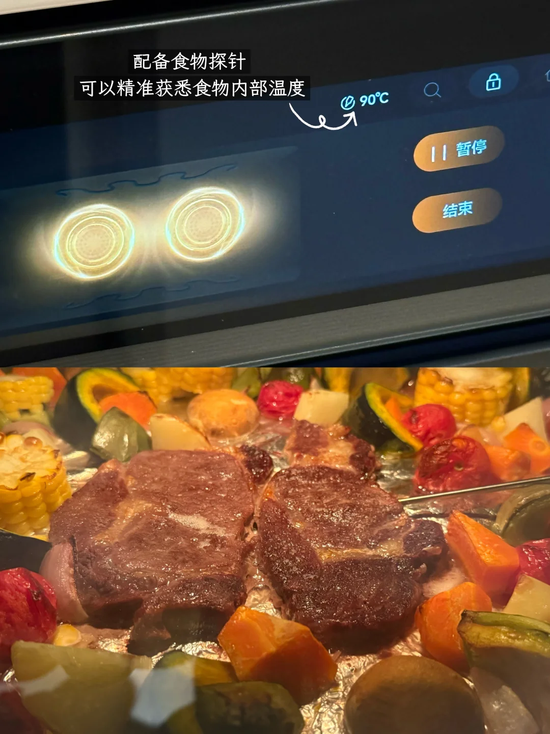 烤牛排也绝,双热风加持,上色均匀、外酥里嫩,连我妈都夸好吃。它的冷凝排气也很贴心,微量低温排出,不伤橱柜不烫手,小厨房用着特别安心。另外它还配备了食物探针,能更精准地获知食物内部的温度,不用凭感觉猜测熟没熟。