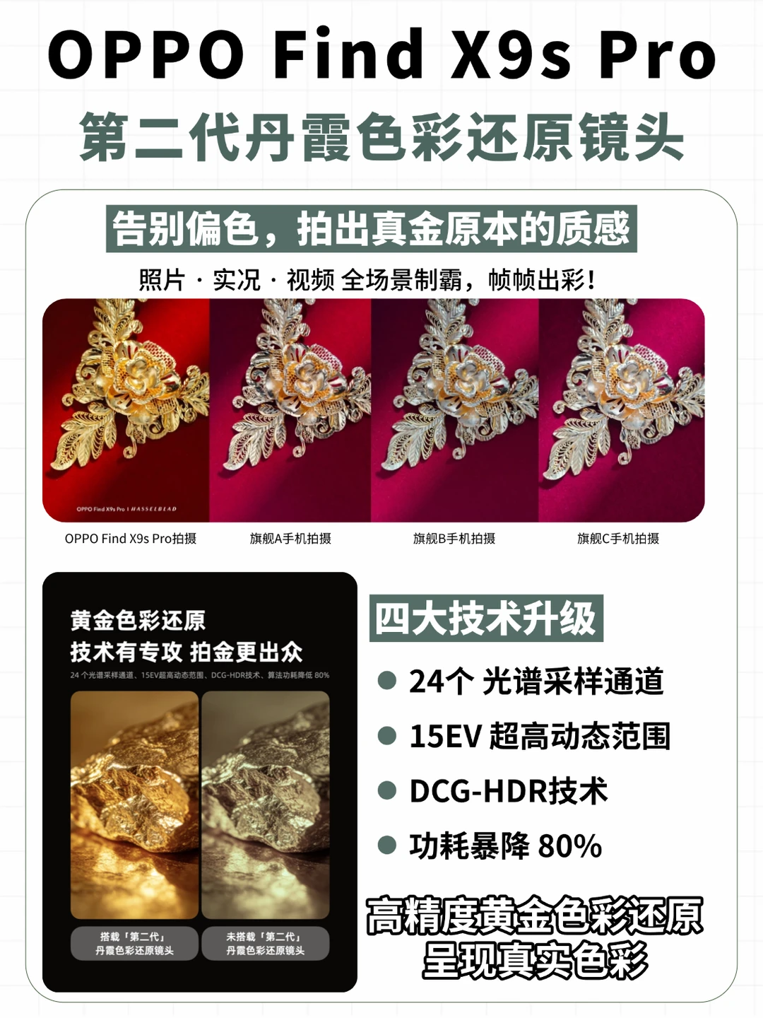 看了爆料的对比图,搭载这个新镜头的 OPPO Find X9s Pro 拍金子颜色非常精准,逆光暗光都能处理得很好,而且照片、实况和视频都能全时生效。