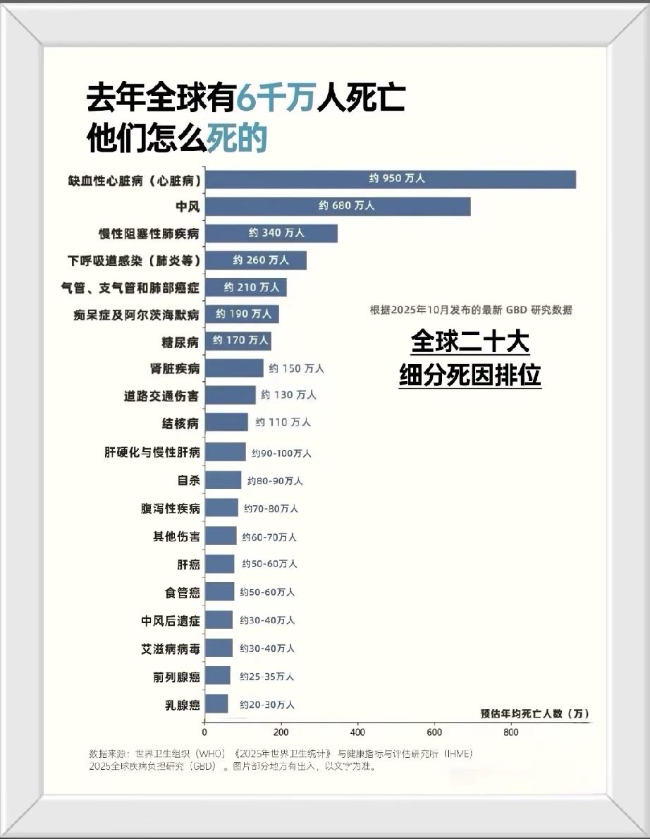 太可怕了!心脏病竟然是对人类威胁最大的隐形杀手![发怒] 数据源自WHO(2025)与GBD研究,权威度极高。心血管疾病(950万)与中风(680万)蝉联全球前两大杀手,合计致死超1630万/年,[流泪]占全球总死亡(6000万)近27%。 其根本在于:发病隐匿、高复发率,且与老龄化、高血压、[微风]熬夜久坐强绑定。 数据对比显示:中风致残率超70%,心血管猝死率高,二者兼具“高潜伏、高致死、高负担”,成为人类最大隐形威胁,[心]警示严控三高与生活方式是破局关键。心脏病征兆 心血管高危 心脏病误区 亲人心脏病 心脏病禁忌 心脏病预防知识
