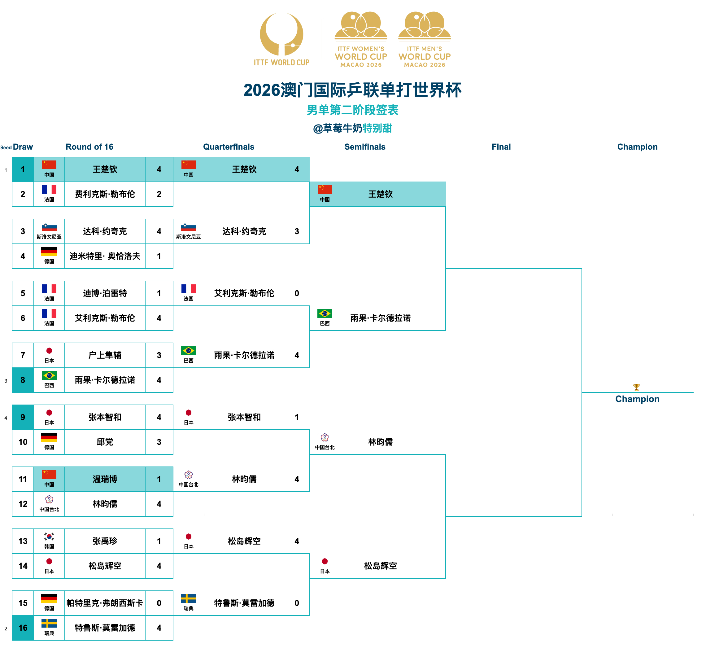 2026澳门国际乒联单打世界杯丨男单四强王楚钦🇨🇳VS雨果·卡尔德拉诺🇧🇷林昀儒(中国台北)VS松岛辉空🇯🇵