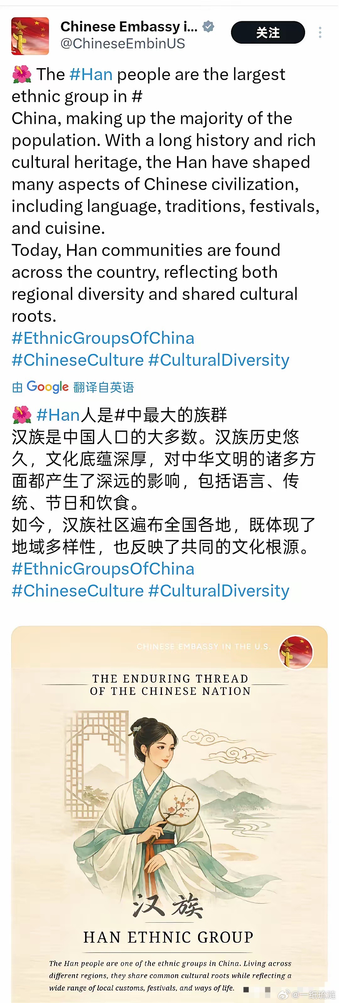 中国驻美大使馆隆重向世界介绍汉族。配的图片是汉服。并且说到汉族是中国人口的大多数。对中华文明的诸多方面产生了深刻影响。