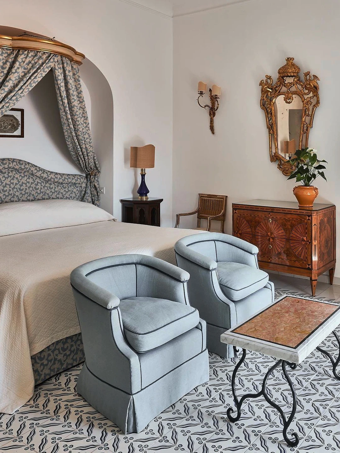 第勒尼安海的蓝饱和度高、都有点不真实的了~而矗立在悬崖上的这家酒店,是由拿坡里贵族家族的夏宫改建而成,南意的感觉扑面而来。