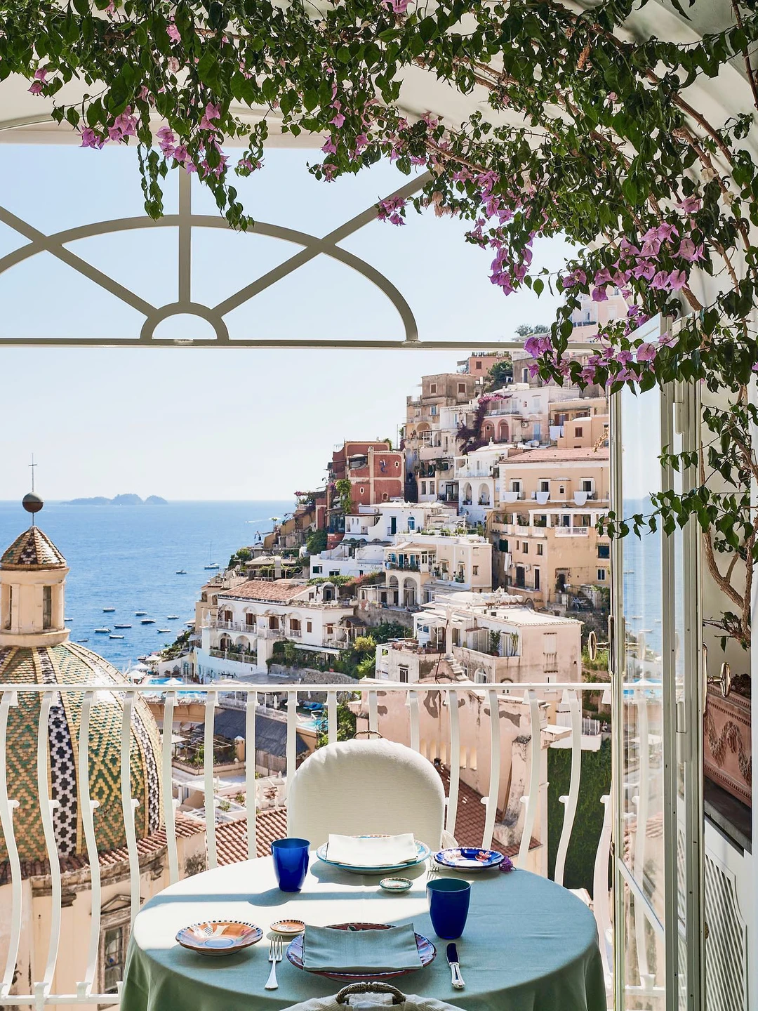 几乎每一间客房都带阳台,三角梅攀满了栏杆。站在阳台上,波西塔诺的阶梯式村落就在正前方,俯瞰就是蔚蓝的海。