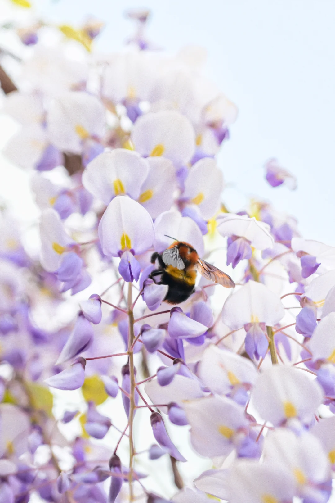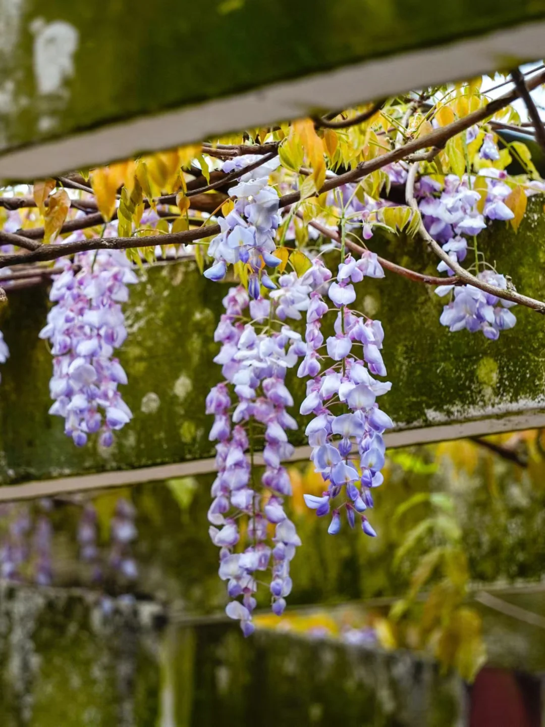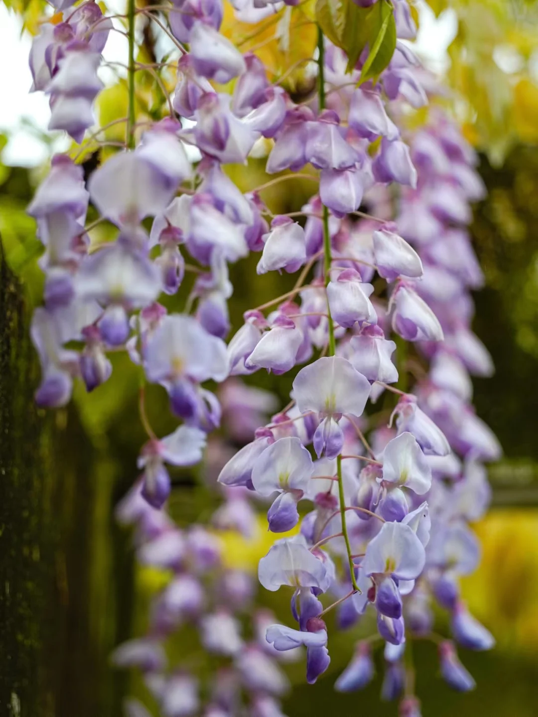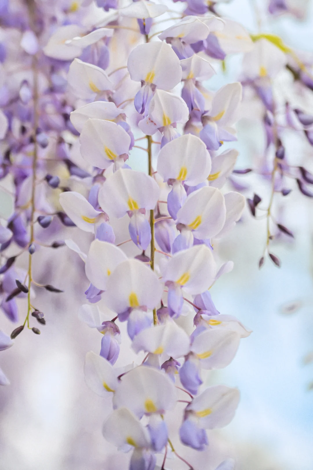 “紫”和“藤”二字,点出了紫藤最为典型的两个特征:花开为紫,茎绕为藤。而紫藤非常的“懒”,当其他春花盛开的初春之时,紫藤还是光秃秃的,看上去没有一点生气。直到仲春时节,紫藤才从酣睡中醒来,从枝头上抽出几片羽状的叶片,中间还夹杂着一些青绿色的小穗——这就是紫藤的花序。