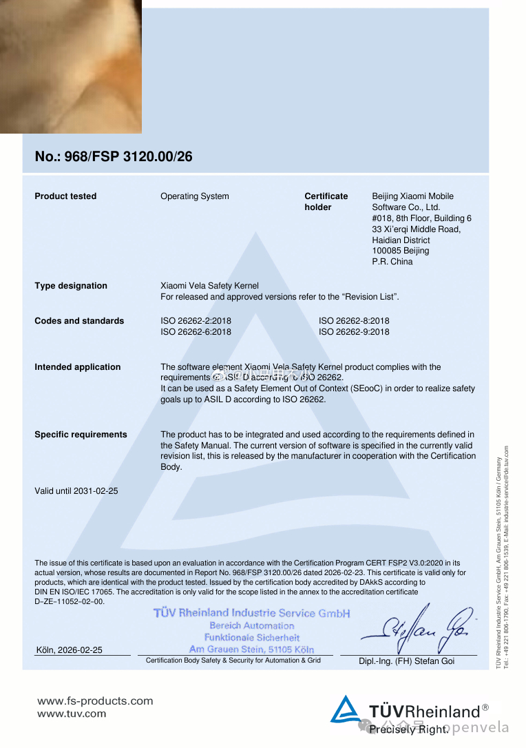 Xiaomi Vela Safety 内核顺利通过全球权威认证机构德国莱茵TÜV的严苛评估,成功获得ISO 26262 ASIL-D功能安全认证。ASIL‑D 是功能安全领域的最高等级认证,此次通过标志着Xiaomi Vela Safety内核在功能安全、可靠性与技术合规性方面已达到国际领先水准,为小米汽车高安全场景的规模化落地筑牢了关键技术底座。