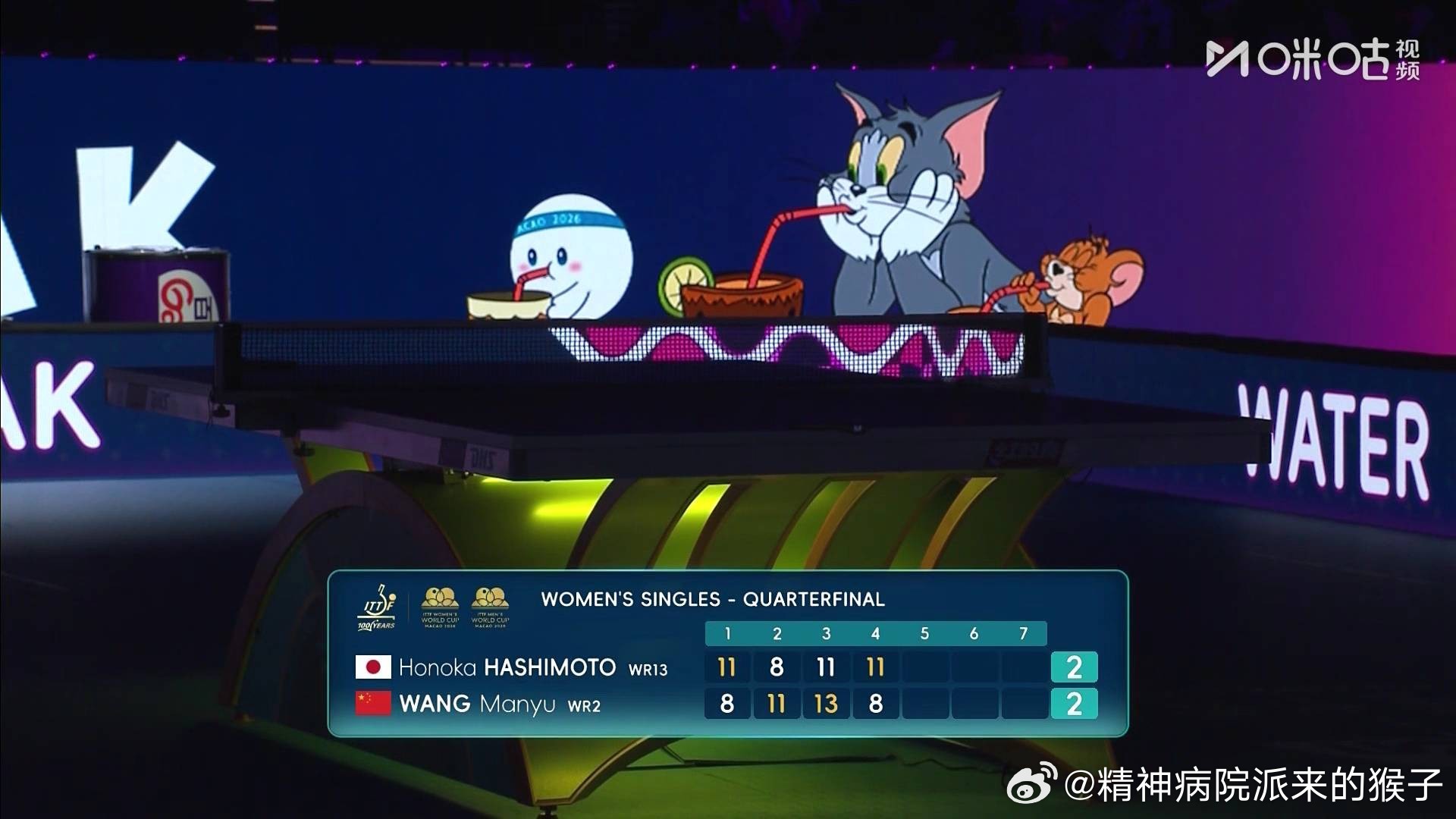 王曼昱4比2桥本帆乃香(-8,8,11,-8,5,9)晋级2026年澳门乒乓球世