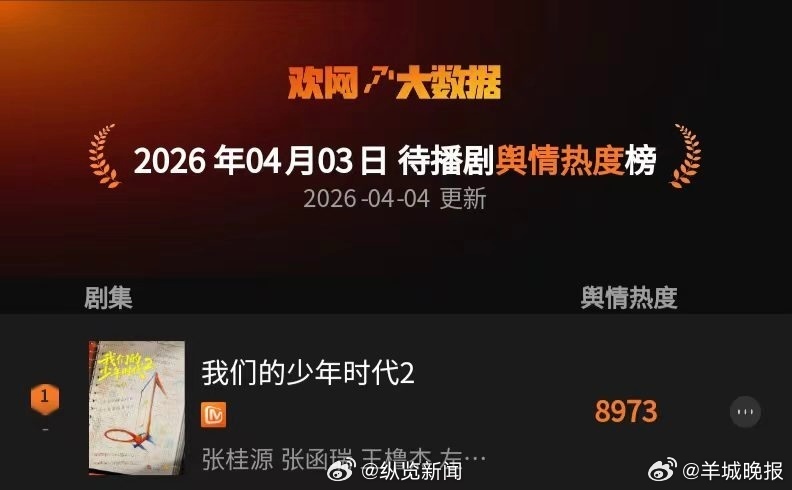 【#我们的少年时代2热度连续3天TOP1#】据欢网大数据消息,4月3日待播剧舆情热度TOP10出炉,电视剧《我们的少年时代2》连续3天登顶榜首!