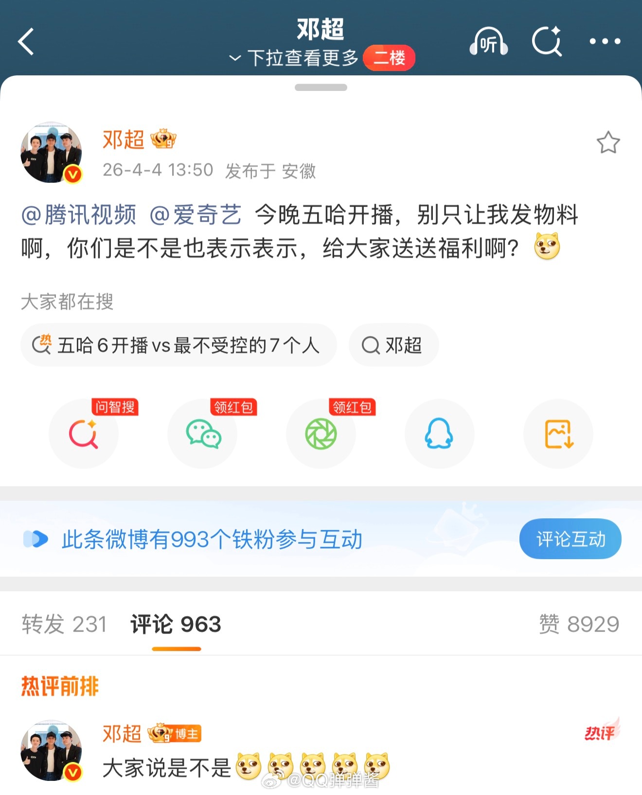 邓超一句话让腾讯爱奇艺打起来邓超一句话引爆全网,腾讯爱奇艺为《五哈6》开播福利“开战”,宠粉还得看超哥,坐等双平台福利,今晚必须追更!