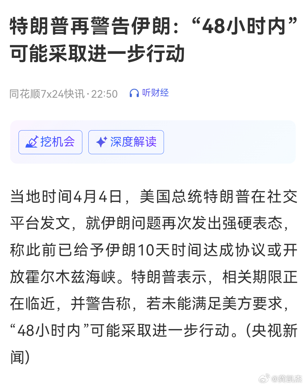 不会又要卡开市吧?特朗普威胁伊朗称,相关期限正在临近,若未能满足美方要求,"48小时内"可能采取进一步行动。