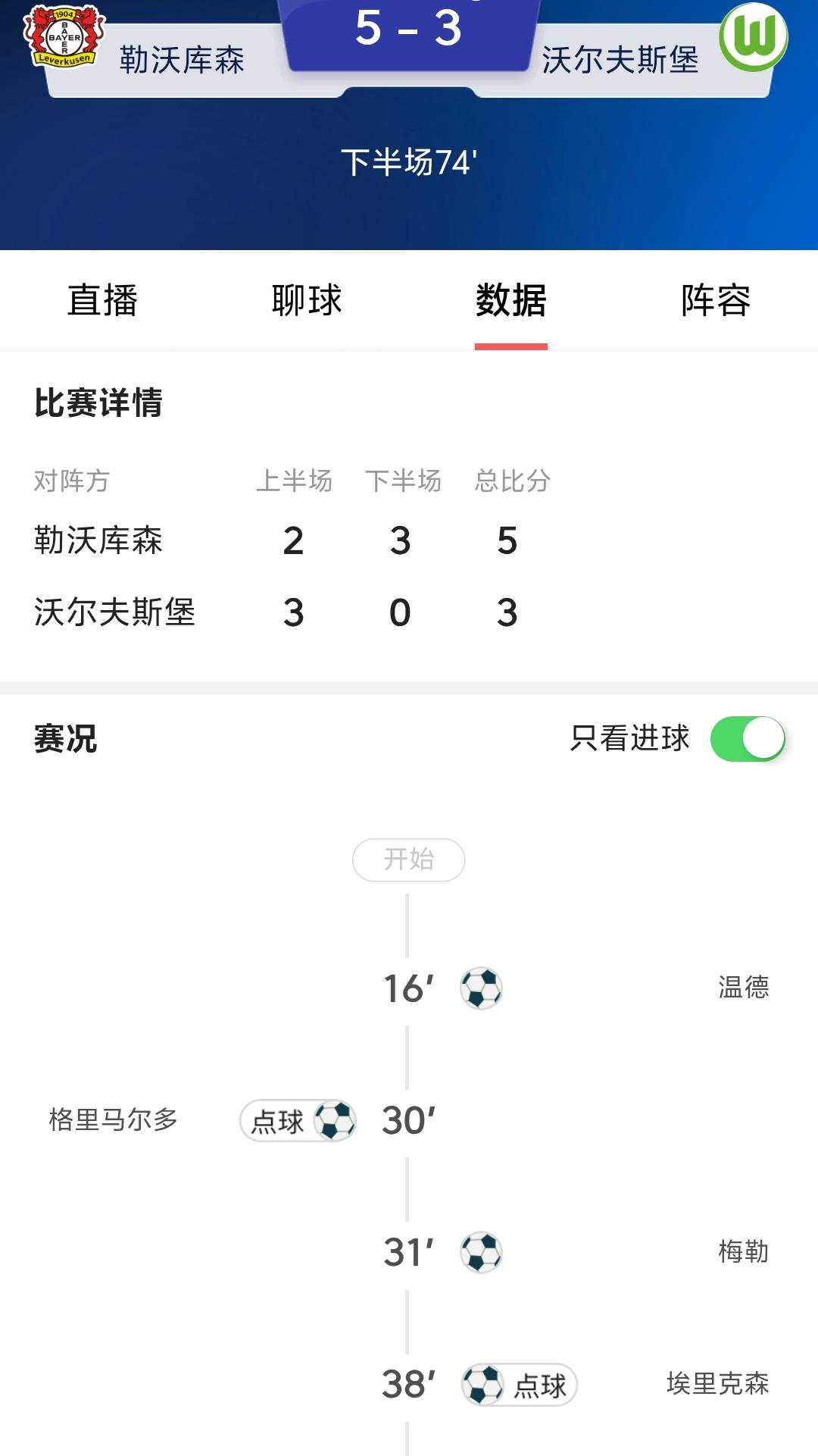 勒沃库森和沃尔夫斯堡这场比赛怎么看着有点不正常啊,上半场沃尔夫斯堡还3:2领先,结果下半场不到70分钟,勒沃库森就连进三球,比赛还有20多分钟就5:3逆转比分!