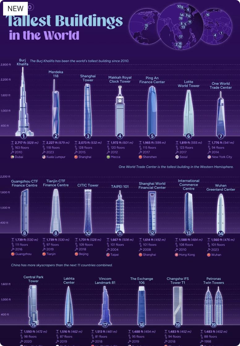 外媒:2026年全球已完工的100座最高建筑排名公布,数据由垂直城市主义委员会(Council on Vertical Urbanism)维护。 榜单显示,迪拜哈利法塔以828米高居榜首,吉隆坡默迪卡118大厦(679米)和上海中心大厦(632米)分列二、三位。 中国表现突出,在前100名中占据超过半数席位,深圳、上海、武汉等城市均有多个项目上榜。从建筑功能看,办公用途占比最高,其次是酒店和住宅;结构材料以混凝土-钢复合结构为主流。 近年完工项目包括2025年竣工的摩根大通全球总部(423米)和济南平安金融中心(360米)等,反映出全球超高层建筑持续向亚洲集中,尤其是中国和中东地区。