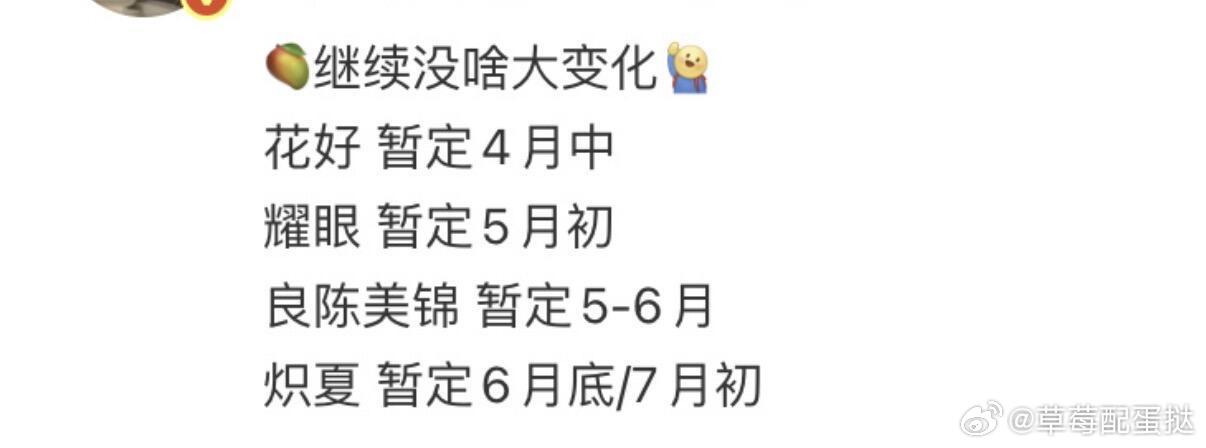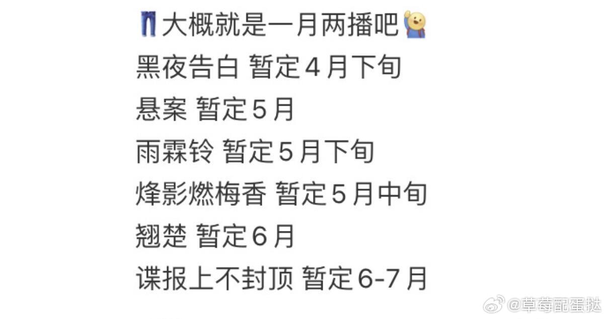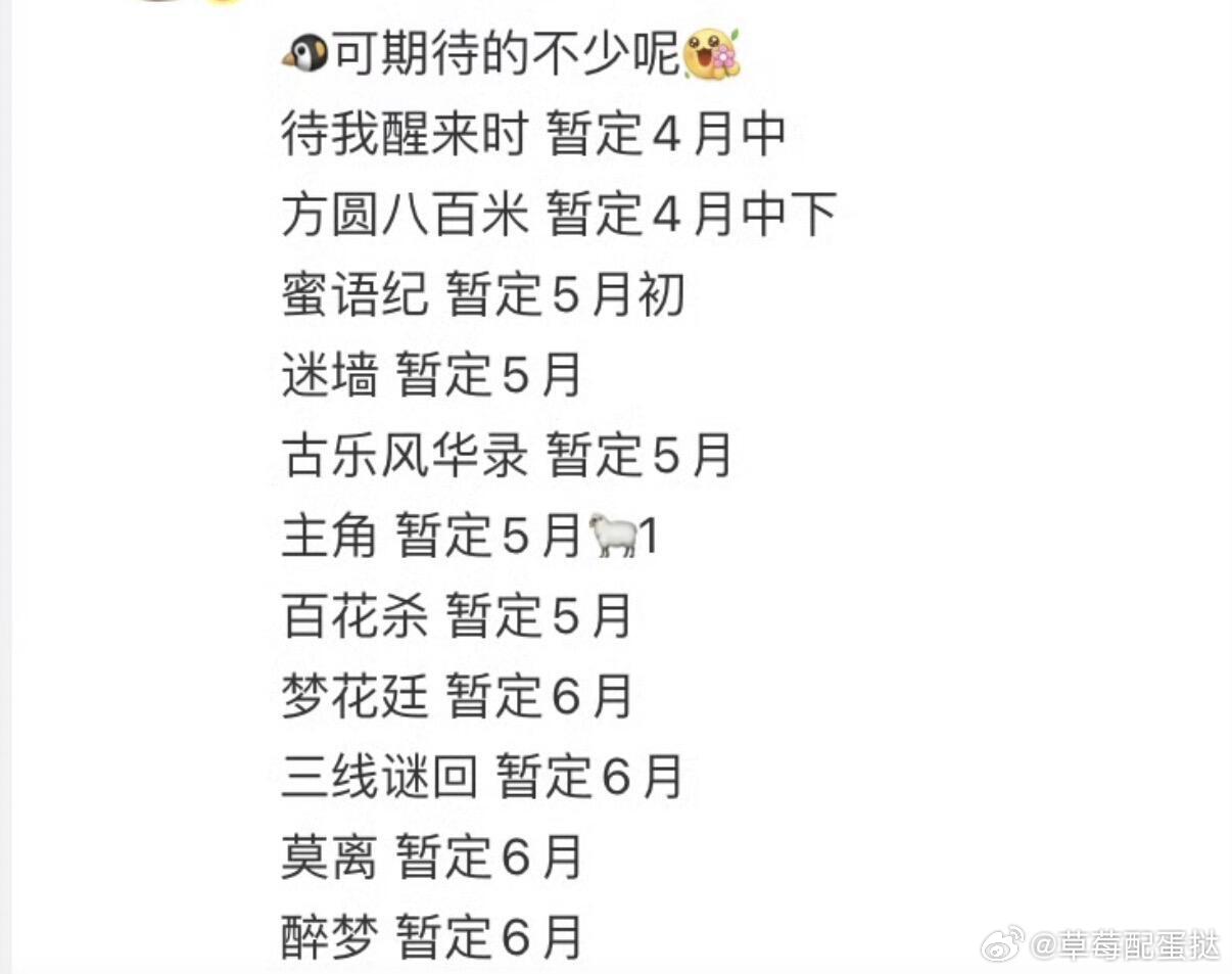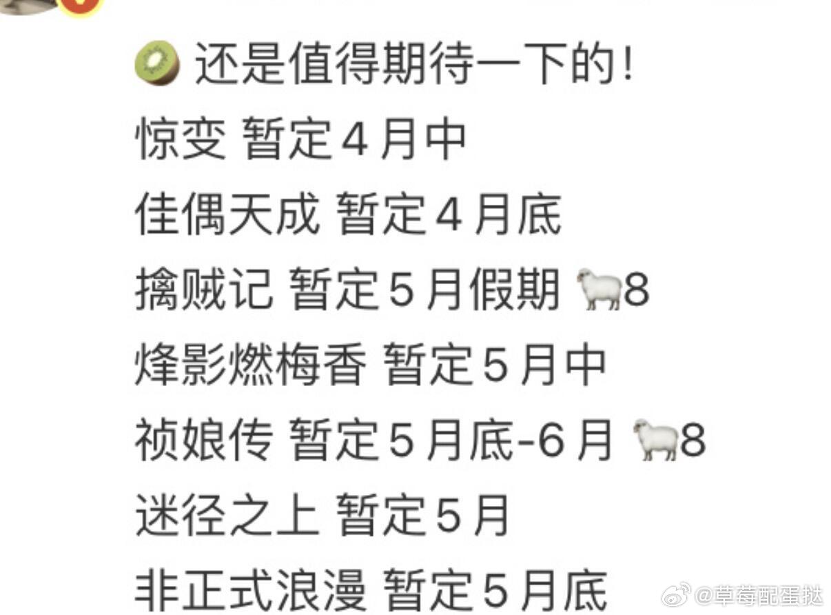 🍉曝四大平台近期排播爱奇艺《惊变》(于和伟、辛柏青):4月中旬《佳偶天成》(任嘉伦、王鹤润):4月底(腾讯视频联播)《黑夜告白》(潘粤明、王鹤棣):4月下旬(优酷联播)腾讯视频《待我醒来时》(景甜、张新成):4月中旬《方圆八百米》(许凯、丁勇岱):4月中下旬《花好》(同步湖南卫视):4月中优酷《黑夜告白》:4月下旬(悬疑题材,预告热度高)《悬案》(岳云鹏、杨烁):4月底或5月初芒果TV头部新剧空缺,主推《良陈美锦》