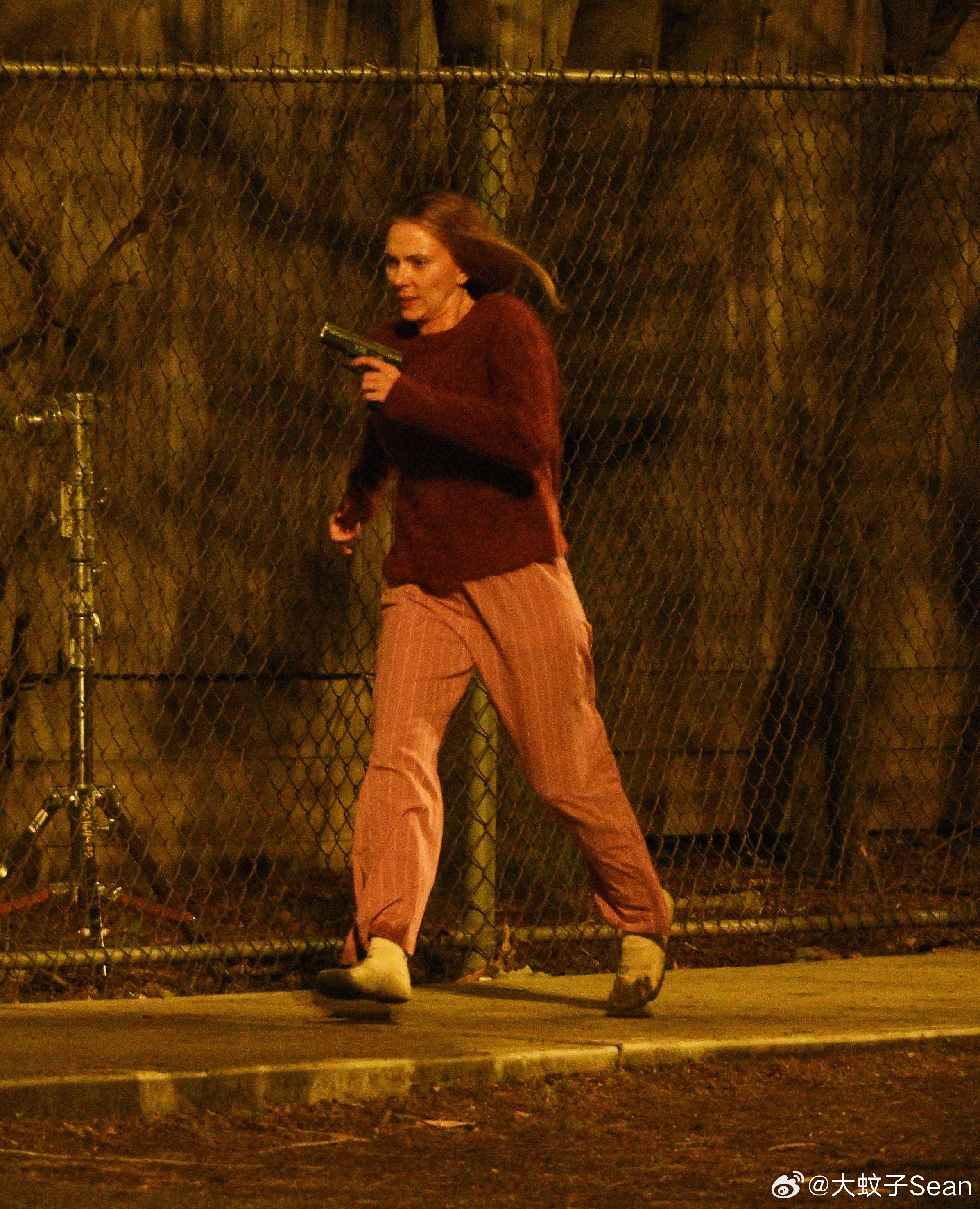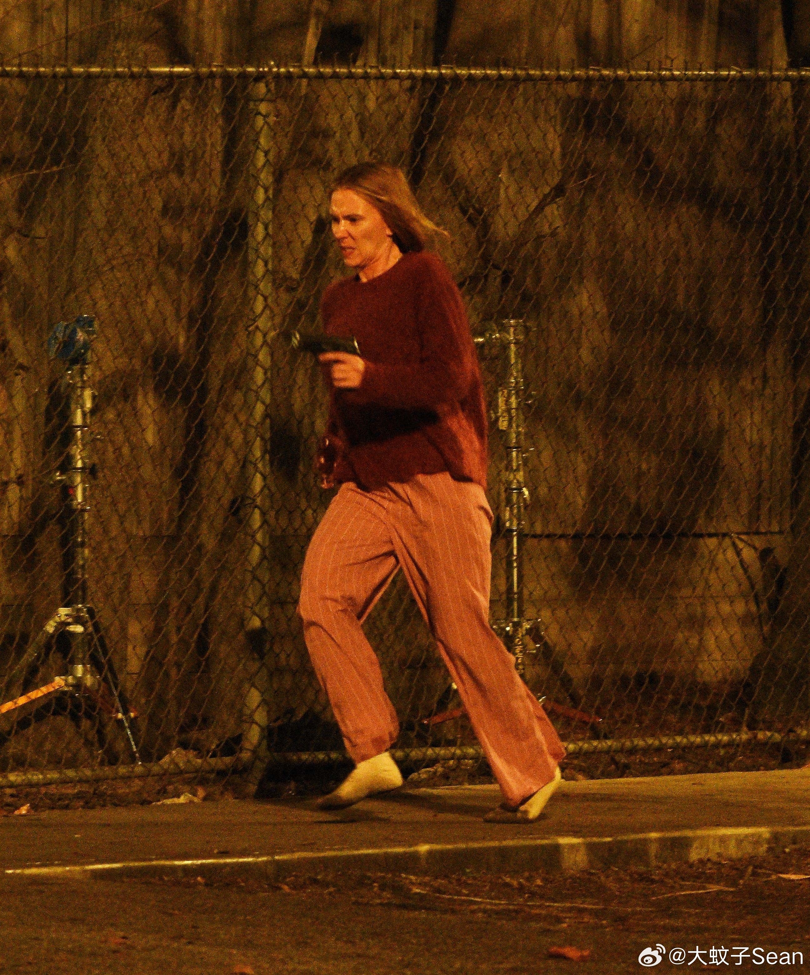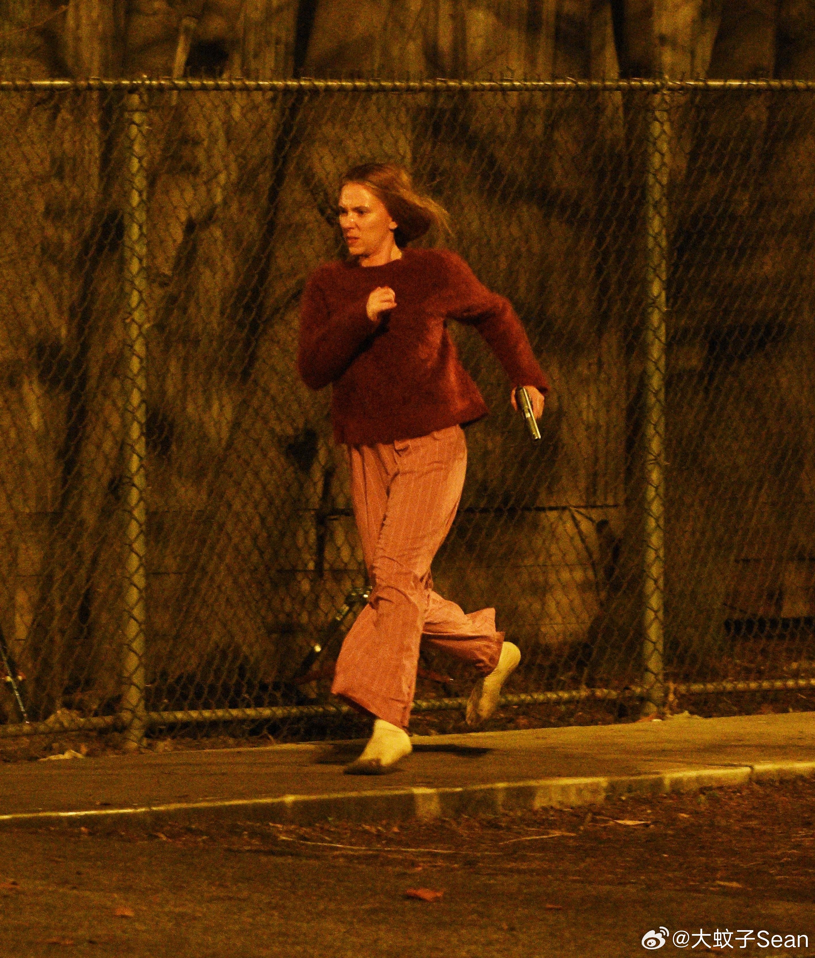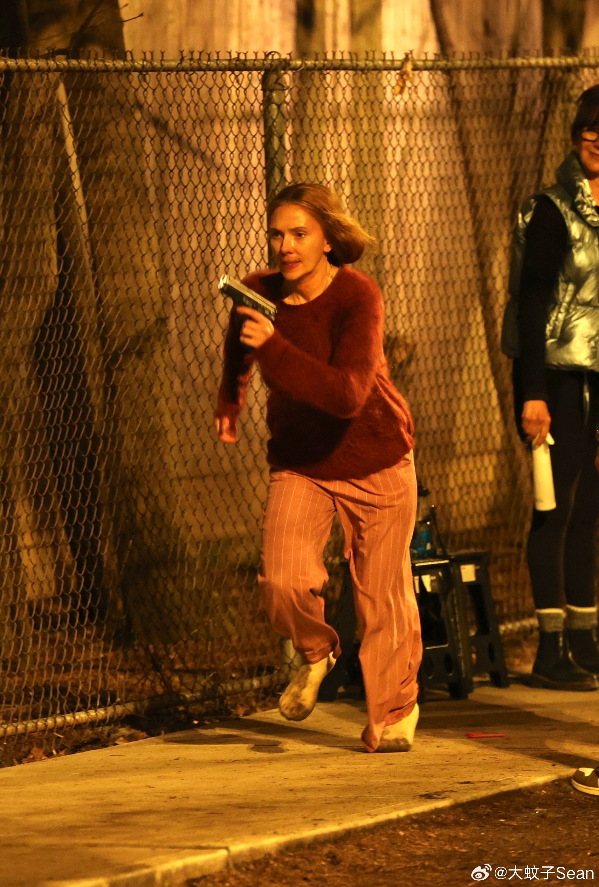 scarlett johansson斯嘉丽约翰逊在纽约为《驱魔人》拍摄夜戏,和替身一起拍摄动作场景,接上之前跑出房子的戏份