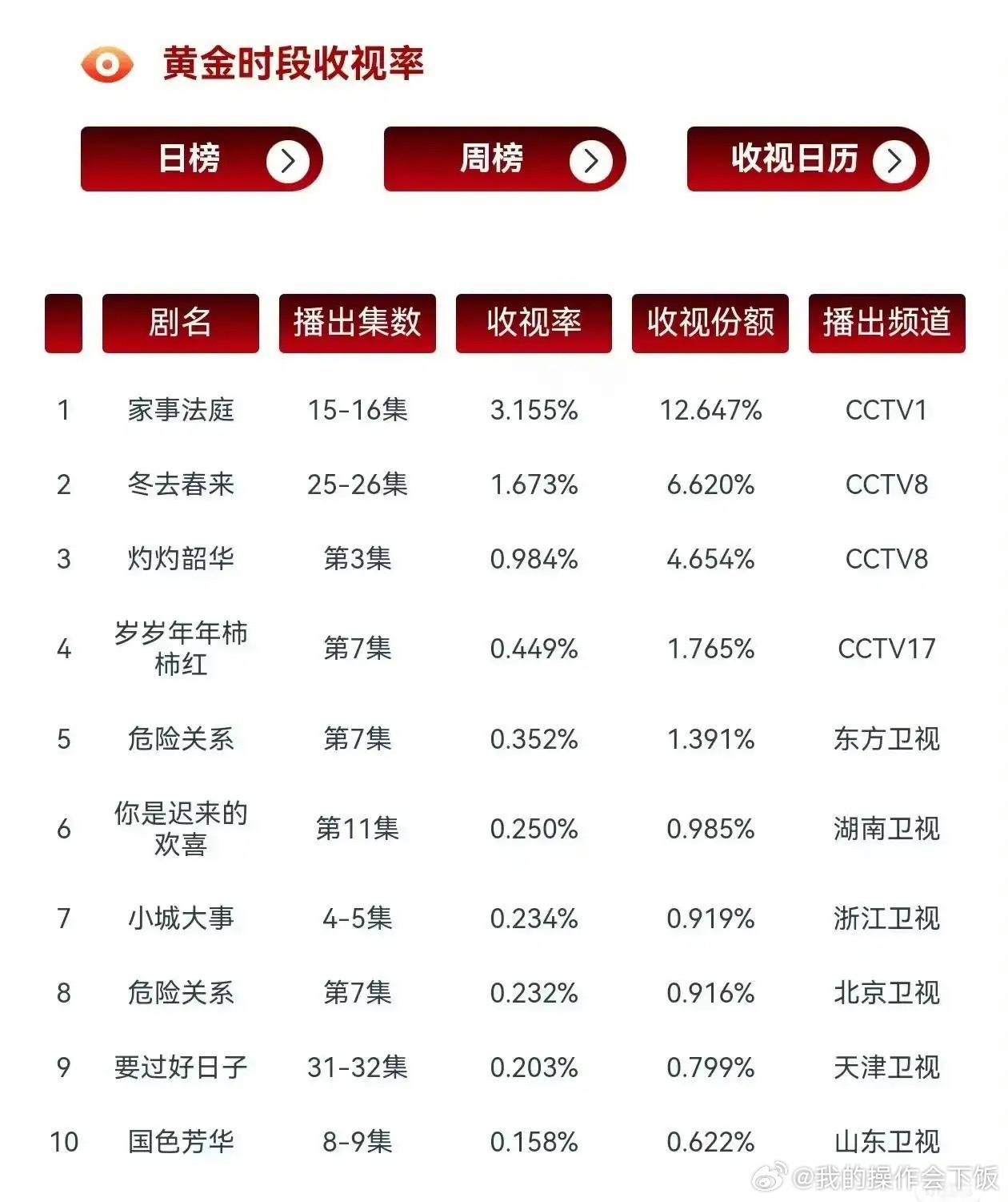 央视一套杀疯了!《家事法庭》收视率断层碾压,卫视剧集体哑火《家事法庭》以3.155%的收视率、12.647%的收视份额断层登顶,直接把第二名《冬去春来》(1.673%)甩了近一倍,卫视剧更是被按在地上摩擦。东方、北京双台联播的《危险关系》,最高收视才0.352%;湖南卫视《你是迟来的欢喜》、浙江卫视《小城大事》等头部卫视剧,收视率集体跌破0.3%,连央视一套的零头都不到。