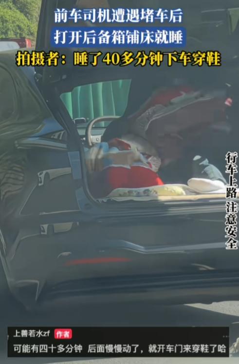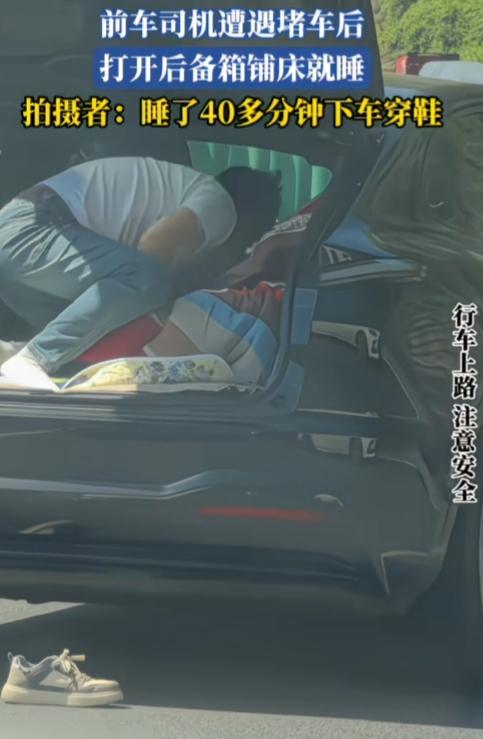 原来堵车还可以这么做!绝了! 云南,一男子开车遭遇堵车后,打开后备箱,脱鞋,上车,铺床就睡,睡了40多分钟才下车穿鞋。 这心态也是没谁了,反正动不了,干着急也没用,还不如躺平休息,既不路怒也不烦躁。睡饱了才有精力继续开车,太通透了! 男子睡眠质量也好,说睡就睡,说醒就醒,后面车慢慢动起来了,他也就起床下车穿鞋开车了。 不过也得像他这样,确认是彻底堵死不动了才敢这么操作,要是走走停停可千万别学,安全第一。 这种随遇而安的心态,堵车的松弛感,真值得堵车人学习!