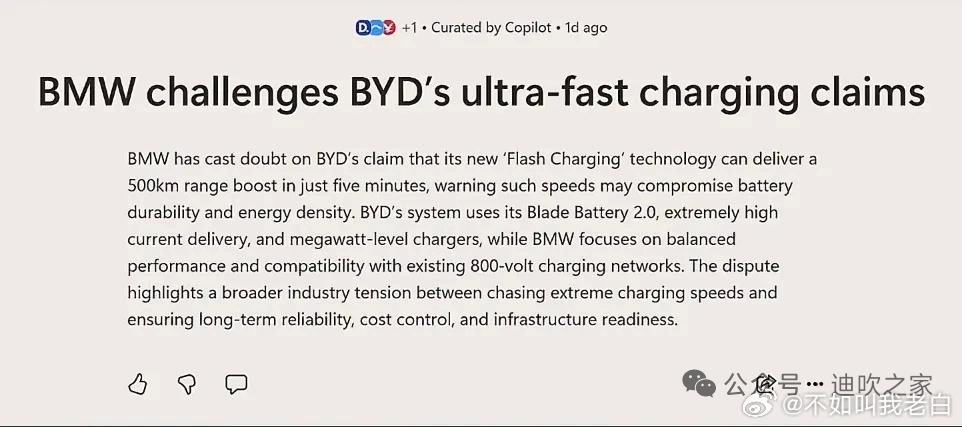 更微妙的是时间点。比亚迪闪充发布一个月了,宝马一直没吭声,现在突然跳出来说"要谨慎",而比亚迪的闪充车马上开始出口海外。