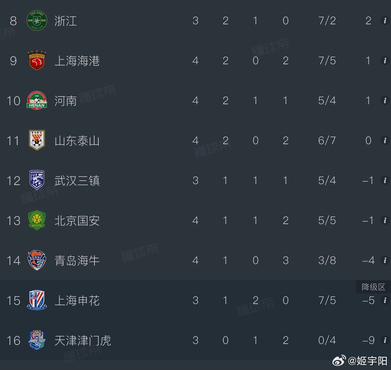 截止今天比赛结束,中超仍然有 5 支球队暂时处于负分状态(图二)。武汉三镇明天如果能从深圳新鹏城身上拿到 1 分,也将告别负分。