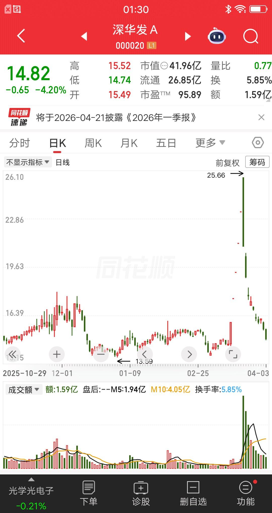 非常惨烈!股价从25元跌到14元,仅用了10个交易日暴跌44%,还能找出比它更惨的吗? 3月23号上演天地板,24号跌9.76%,25号跌6.7%。26号收了一根假阳线,其实跌了两个点。后面继续跌跌跌跌跌跌,就问你们惨不惨? 不管是打板模式,低吸模式,还是博弈超跌反弹,通通全部闷杀。每一天买入都是错误的决定,目前看仍未止跌。 该票属于光学光电子板块,异动解读是深圳icon旧改+液晶显示+物业经营,非常偏门。涨的莫名其妙,跌的也莫名其妙。这个票真应该好好查一查,到底哪路资金在搞鬼。 谁在该票上吃面了,分享一下感受吧。