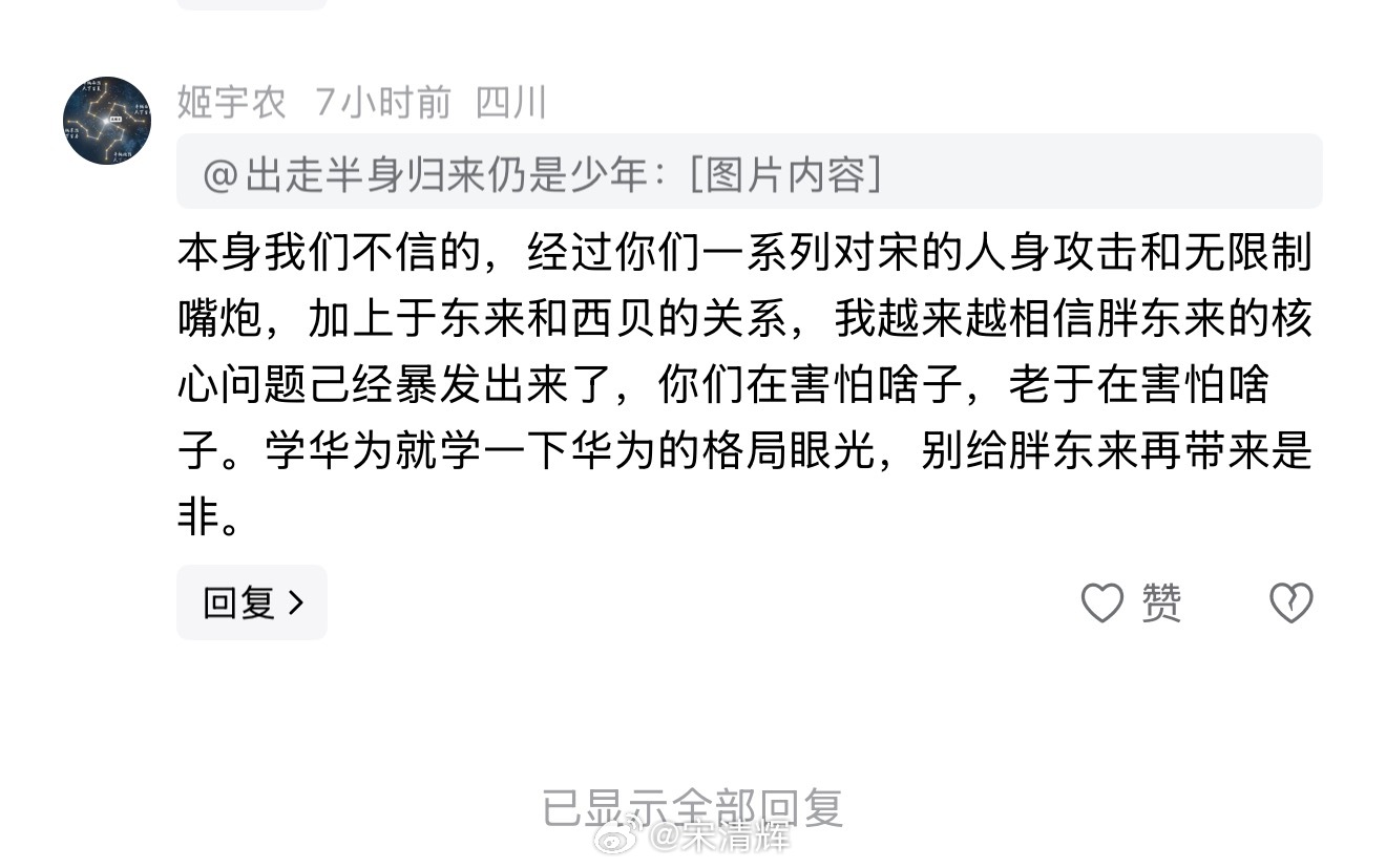 四川网友留言 本身我们不信的,经过你们一系列对宋的人身攻击和无限制嘴炮,加上于东来和西贝的关系,我越来越相信胖东来的核心问题己经暴发出来了,你们在害怕啥子,老于在害怕啥子。学华为就学一下华为的格局眼光,别给胖东来再带来是非。于东来打压言论已无底线