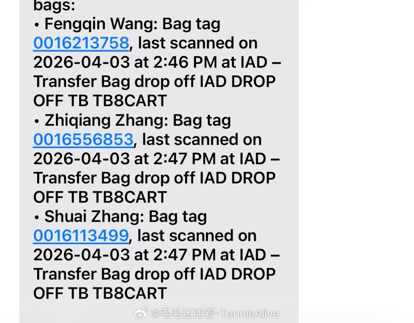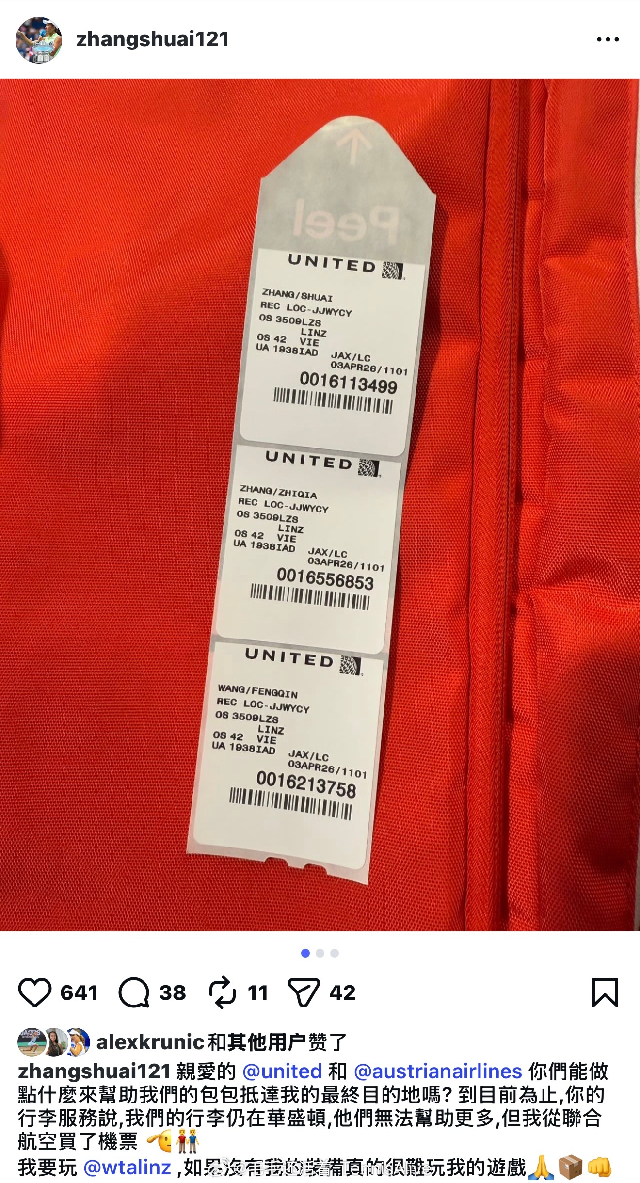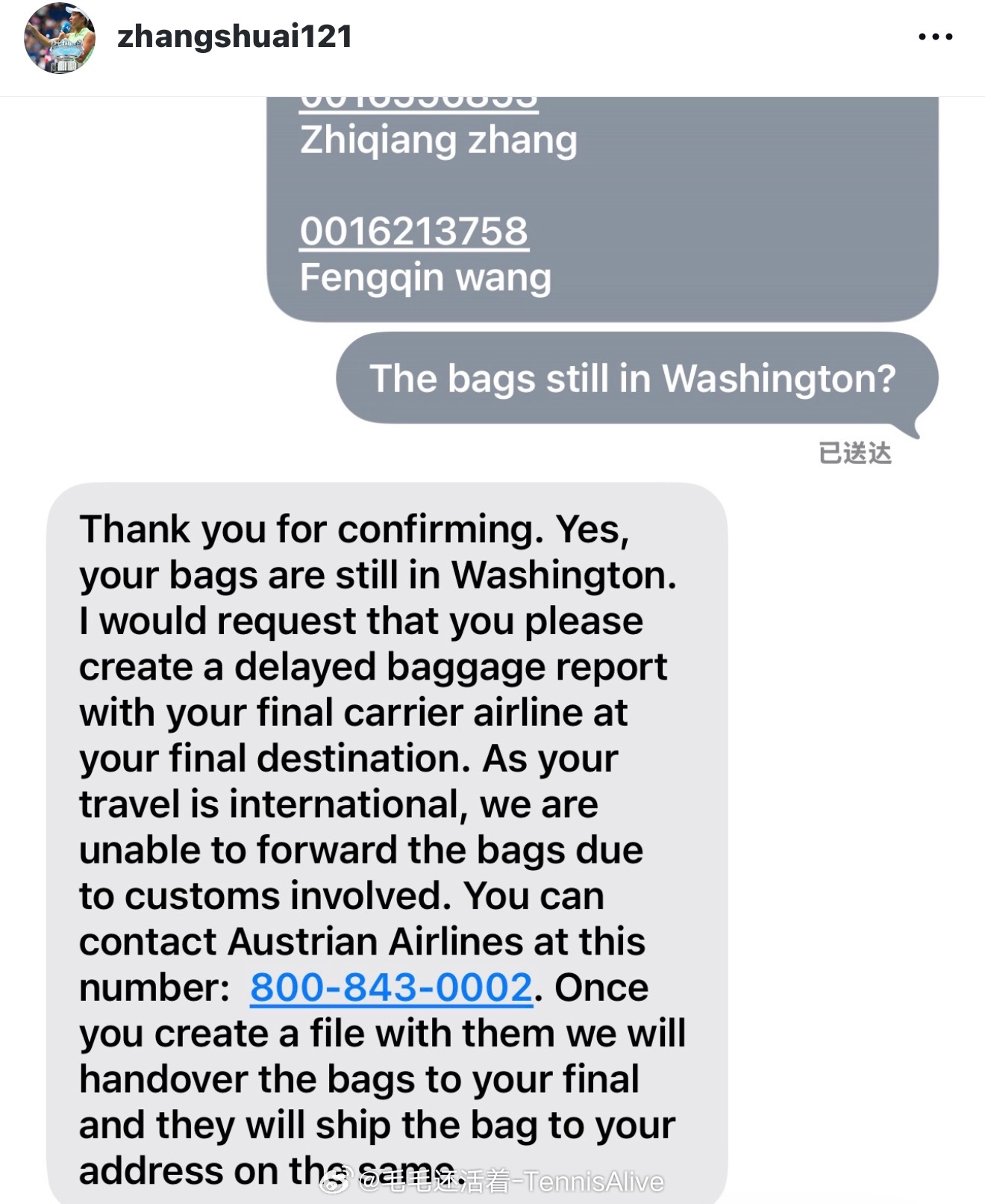 张帅坐联合航空抵达林茨参赛。可是张帅的行李却未抵达,还在华盛顿。张帅发文求助,否则将影响参赛。