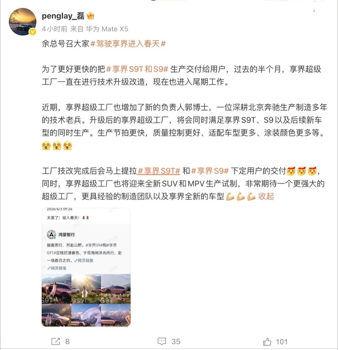 华为智选车产品总监(享界系列)彭磊在微博发文透露,享界超级工厂技术升级进入尾声。待技术改造完成后,将会马上提拉享界 S9/S9T 下定用户的交付,也将迎来全新 SUV 和 MPV 车型的生产试制。